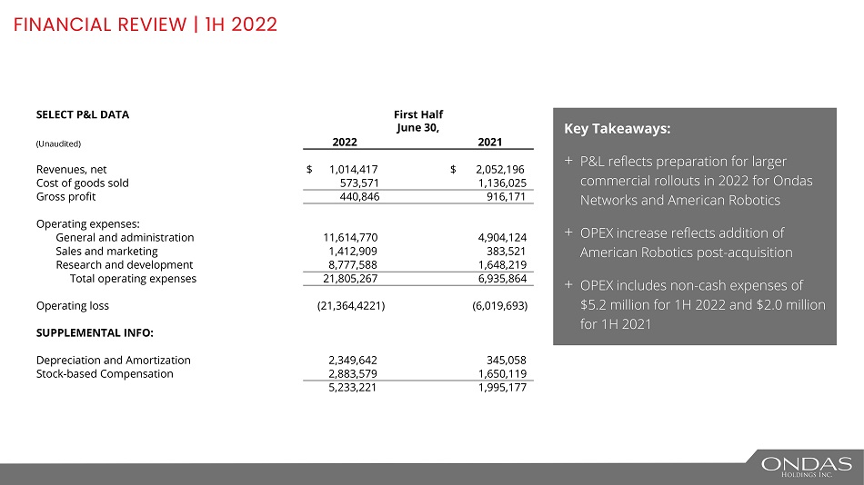 F I N A N C I A L RE V I E W | 1 H 2 0 2 2 Key Takeaways: + P&L reflects preparation for larger commercial rollouts in 2022 for Ondas Networks and American Robotics + O PEX inc r e as e r e f lect s a d d iti o n of American Robotics post - acquisition + O PEX inc lu d es no n - c a sh expe n ses of $5.2 million for 1H 2022 and $2.0 million for 1H 2021 SE L E CT P&L DATA F i r s t H a l f Ju n e 30, (Unaudited) 2022 2021 Revenues, net $ 1,014,417 $ 2,052,196 Cost of goods sold 573,571 1,136,025 Gross profit 440,846 916,171 Operating expenses: General and administration 11,614,770 4,904,124 Sales and marketing 1,412,909 383,521 Research and development 8,777,588 1,648,219 Total operating expenses 21,805,267 6,935,864 Operating loss (21,364,4221) (6,019,693) SUPPLEMENTAL INFO: Depreciation and Amortization 2,349,642 345,058 Stock - based Compensation 2,883,579 1,650,119 5,233,221 1,995,177