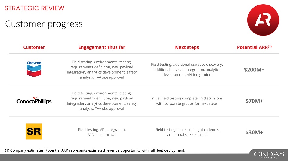 Customer Engagement thus far Next steps Potential ARR (1) Field testing, environmental testing, requirements definition, new payload integration, analytics development, safety a n a l y si s, F A A sit e a p p ro v a l Field testing, additional use case discovery, additional payload integration, analytics development, API integration $200M+ Field testing, environmental testing, requirements definition, new payload integration, analytics development, safety a n a l y si s, F A A sit e a p p ro v a l Initial field testing complete, in discussions with corporate groups for next steps $70M+ Field testing, API integration, F A A si t e a pp r o val Field testing, increased flight cadence, additional site selection $30M+ STRATEGIC REVIEW Customer progress (1) Company estimates: Potential ARR represents estimated revenue opportunity with full fleet deployment.
