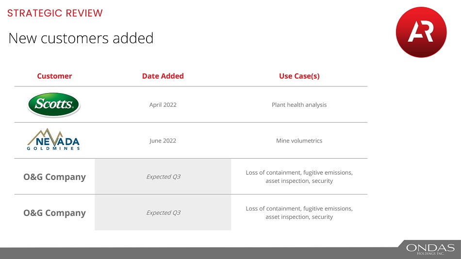 Customer Date Added Use Case(s) A pr i l 2 0 22 Plant health analysis June 2022 Mine volumetrics O&G Company Expected Q3 Loss of containment, fugitive emissions, asset inspection, security O&G Company Expected Q3 Loss of containment, fugitive emissions, asset inspection, security STRATEGIC REVIEW New customers added