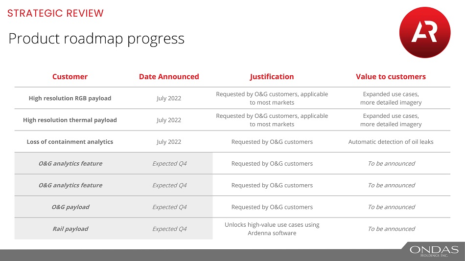 Customer Date Announced Justification Value to customers High resolution RGB payload J u ly 2 0 22 Requested by O&G customers, applicable to most markets Expanded use cases, more detailed imagery High resolution thermal payload J u ly 2 0 22 Requested by O&G customers, applicable to most markets Expanded use cases, more detailed imagery Loss of containment analytics J u ly 2 0 22 Requested by O&G customers Automatic detection of oil leaks O&G a nalyt i c s f e a t ure Expected Q4 Requested by O&G customers To be announced O&G analytics feature Expected Q4 Requested by O&G customers To be announced O &G pa y l o a d Expected Q4 Requested by O&G customers To be announced Rail payload Expected Q4 Unlocks high - value use cases using Ardenna software To be announced STRATEGIC REVIEW Product roadmap progress