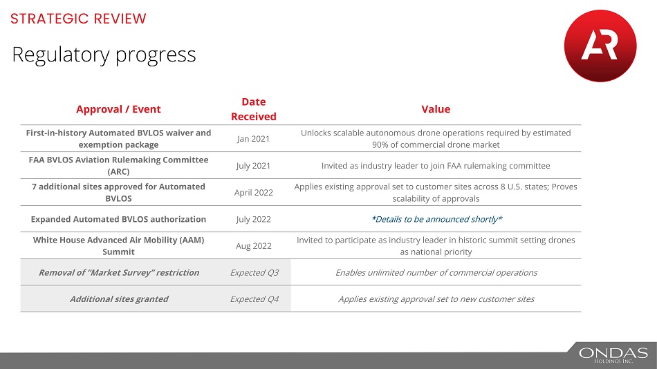 Approval / Event Date Received Value First - in - history Automated BVLOS waiver and exemption package J a n 2 0 21 Unlocks scalable autonomous drone operations required by estimated 90% of commercial drone market FAA BVLOS Aviation Rulemaking Committee (ARC) J u ly 2 0 21 Invited as industry leader to join FAA rulemaking committee 7 additional sites approved for Automated BVLOS Ap ri l 2 0 22 Applies existing approval set to customer sites across 8 U.S. states; Proves scalability of approvals Expanded Automated BVLOS authorization J u ly 2 0 22 *Details to be announced shortly* White House Advanced Air Mobility (AAM) Summit Au g 2 0 22 Invited to participate as industry leader in historic summit setting drones as national priority Removal of “Market Survey” restriction Expected Q3 Enables unlimited number of commercial operations Additional sites granted Expected Q4 Applies existing approval set to new customer sites STRATEGIC REVIEW Regulatory progress