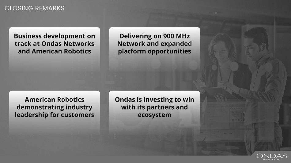 CLOSING REMARKS Business development on track at Ondas Networks and American Robotics Delivering on 900 MHz Network and expanded platform opportunities American Robotics demonstrating industry leadership for customers Ondas is investing to win with its partners and ecosystem