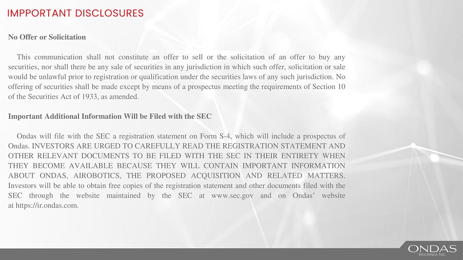 No Offer or Solicitation This communication shall not constitute an offer to sell or the solicitation of an offer to buy any securities, nor shall there be any sale of securities in any jurisdiction in which such offer, solicitation or sale would be unlawful prior to registration or qualification under the securities laws of any such jurisdiction . No offering of securities shall be made except by means of a prospectus meeting the requirements of Section 10 of the Securities Act of 1933 , as amended . Important Additional Information Will be Filed with the SEC Ondas will file with the SEC a registration statement on Form S - 4 , which will include a prospectus of Ondas . INVESTORS ARE URGED TO CAREFULLY READ THE REGISTRATION STATEMENT AND OTHER RELEVANT DOCUMENTS TO BE FILED WITH THE SEC IN THEIR ENTIRETY WHEN THEY BECOME AVAILABLE BECAUSE THEY WILL CONTAIN IMPORTANT INFORMATION ABOUT ONDAS, AIROBOTICS, THE PROPOSED ACQUISITION AND RELATED MATTERS . Investors will be able to obtain free copies of the registration statement and other documents filed with the SEC through the website maintained by the SEC at www . sec . gov and on Ondas’ website at https : //ir . ondas . com . IMPPORTANT DISCLOSURES