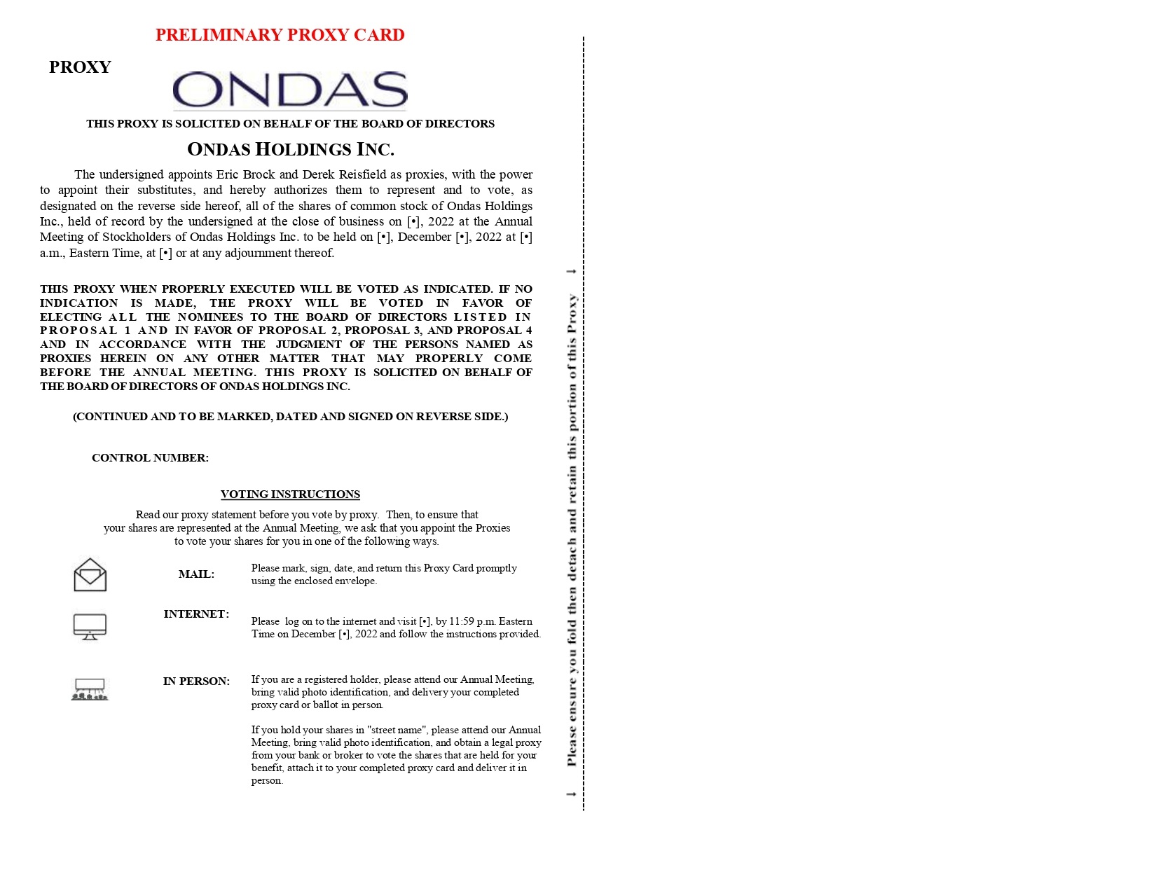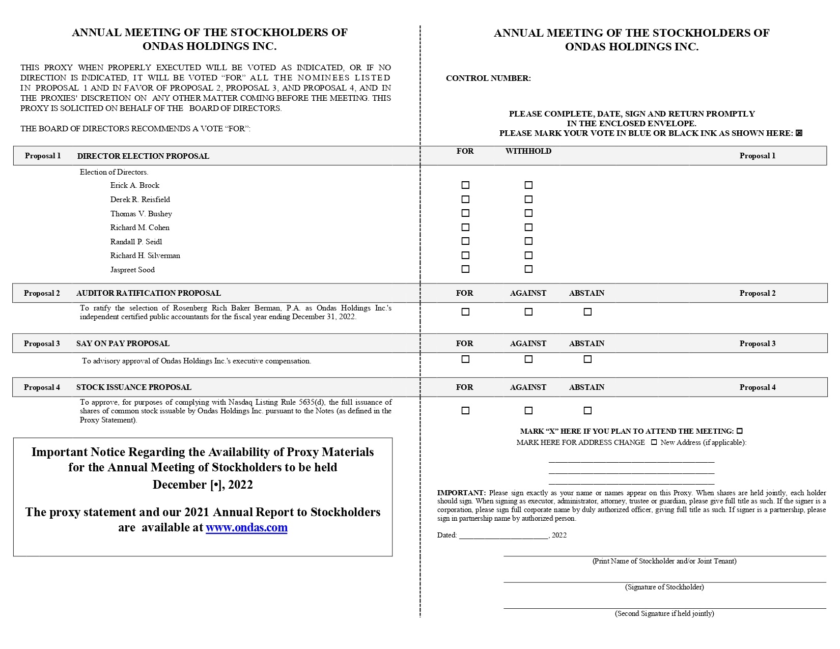 Ondas stockholders of record on November [●], 2021 may submit their proxies as follows: