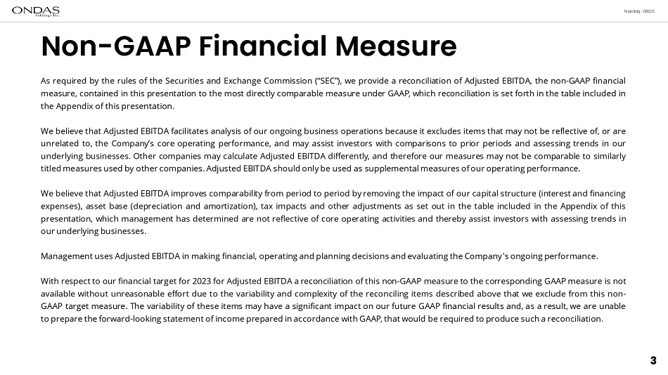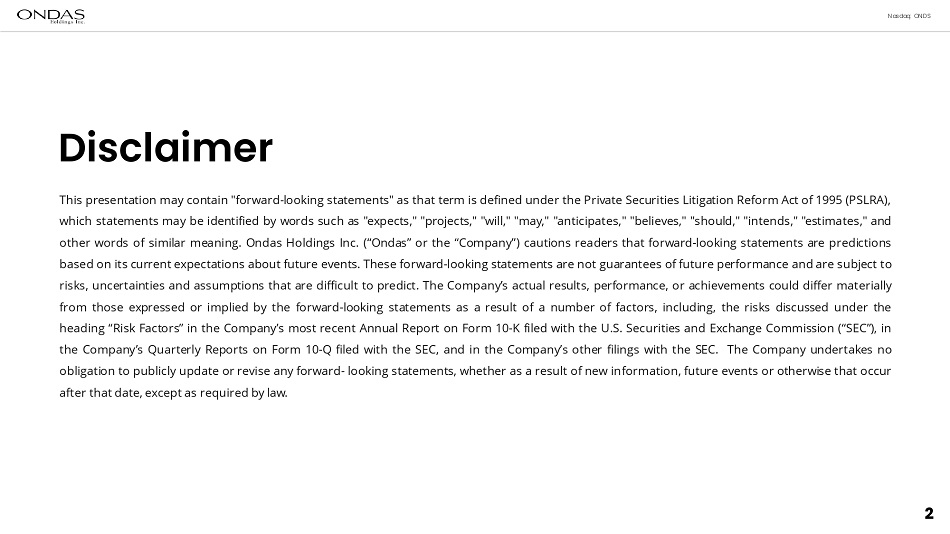 Nasdaq: ONDS This presentation may contain "forward - looking statements" as that term is defined under the Private Securities Litigation Reform Act of 1995 (PSLRA), which statements may be identified by words such as "expects," "projects," "will," "may," "anticipates," "believes," "should," "intends," "estimates," and other words of similar meaning . Ondas Holdings Inc . (“Ondas” or the “Company”) cautions readers that forward - looking statements are predictions based on its current expectations about future events . These forward - looking statements are not guarantees of future performance and are subject to risks, uncertainties and assumptions that are difficult to predict . The Company’s actual results, performance, or achievements could differ materially from those expressed or implied by the forward - looking statements as a result of a number of factors, including, the risks discussed under the heading “Risk Factors” in the Company’s most recent Annual Report on Form 10 - K filed with the U . S . Securities and Exchange Commission (“SEC”), in the Company’s Quarterly Reports on Form 10 - Q filed with the SEC, and in the Company’s other filings with the SEC . The Company undertakes no obligation to publicly update or revise any forward - looking statements, whether as a result of new information, future events or otherwise that occur after that date, except as required by law . 2 Disclaimer