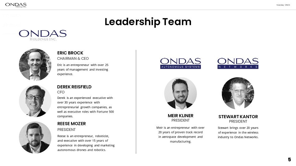 Nasdaq: ONDS Leading technology developer and service provider for commercial drone markets Global leader in hyper - growth commercial drone market Provider of next - generation private industrial wireless networking technologies for critical industrial markets Next - gen data platform upgrade cycle starting with Class I Railroads Autonomous Drones, Data, & AI • Leading Technology • World - Class Talent • Blue Chip Customers • Dominant IP position Ondas positioned for a breakout 2023 4