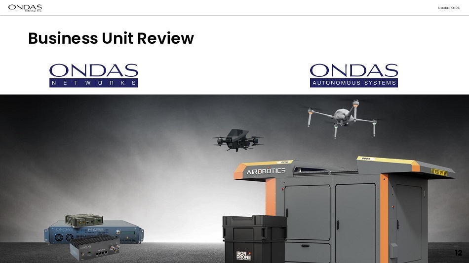 Nasdaq: ONDS Ondas positioned for a breakout 2023 Financial Outlook • Significant revenue growth expected in 2023 and beyond • Reaffirming outlook: • $26 – $30 million 2023 revenue target • $19 – $24 million Adjusted EBITDA • Cash utilization improves: • Ondas Networks operating leverage • Integration of American Robotics and Airobotics • Financial targets for the year are based on: • Existing $13.1 million backlog • Visibility into expected demand from existing customers 11