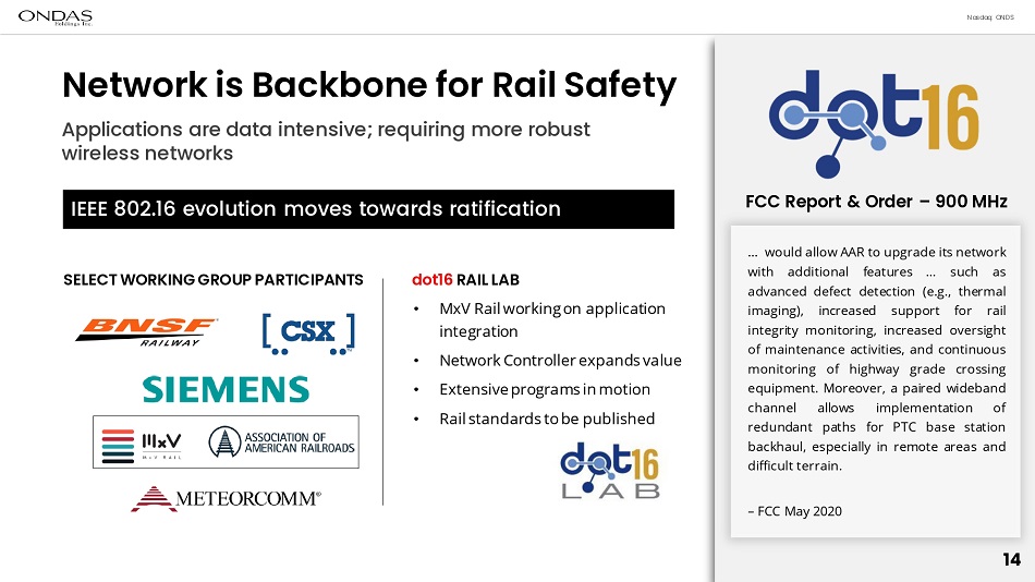 Nasdaq: ONDS Class 1 Railroads dot16 commercial adoption begins 13 Progress on 900 MHz Rollout Rail Safety a Key Focus RAILROAD BEGIN 900 LAUNCH • Producing for initial BNSF & CSX demand • Deliveries accelerate in Q2 • Bookings expand in 2023 with: • BNSF & CSX deepening rollout • New railroads launch activity RECENT EVENTS HIGHLIGHT dot16 VALUE • Notable focus on Rail Safety • 160 MHz comes into focus for AAR & MxV Rail • Pursuing radio programs for Passenger & Transit market