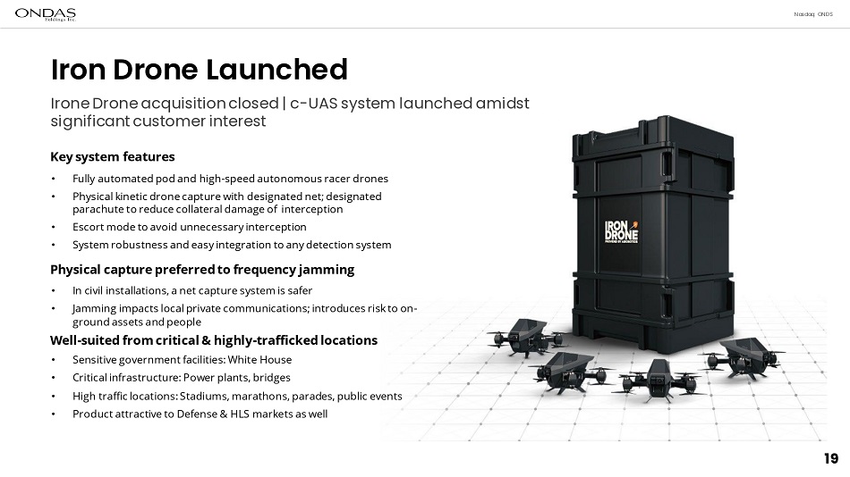 Nasdaq: ONDS Iron Drone Launched 19 Irone Drone acquisition closed | c - UAS system launched amidst significant customer interest Key system features • Fully automated pod and high - speed autonomous racer drones • Physical kinetic drone capture with designated net; designated parachute to reduce collateral damage of interception • Escort mode to avoid unnecessary interception • System robustness and easy integration to any detection system Physical capture preferred to frequency jamming • In civil installations, a net capture system is safer • Jamming impacts local private communications; introduces risk to on - ground assets and people Well - suited from critical & highly - trafficked locations • Sensitive government facilities: White House • Critical infrastructure: Power plants, bridges • High traffic locations: Stadiums, marathons, parades, public events • Product attractive to Defense & HLS markets as well