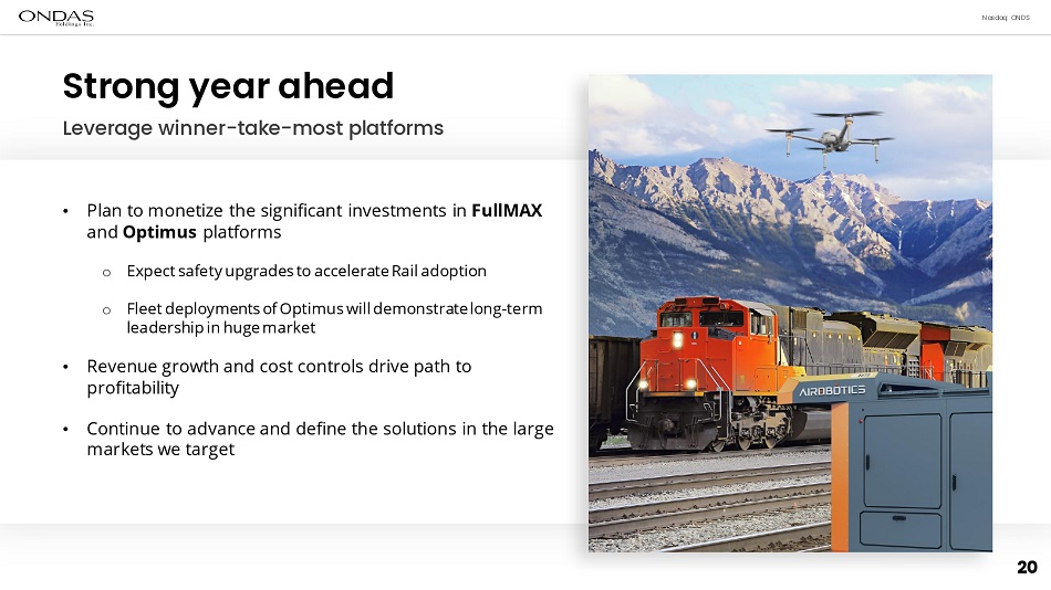 Nasdaq: ONDS Leverage winner - take - most platforms Strong year ahead • Plan to monetize the significant investments in FullMAX and Optimus platforms o Expect safety upgrades to accelerate Rail adoption o Fleet deployments of Optimus will demonstrate long - term leadership in huge market • Revenue growth and cost controls drive path to profitability • Continue to advance and define the solutions in the large markets we target 20