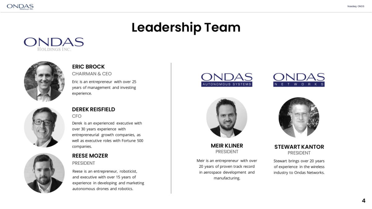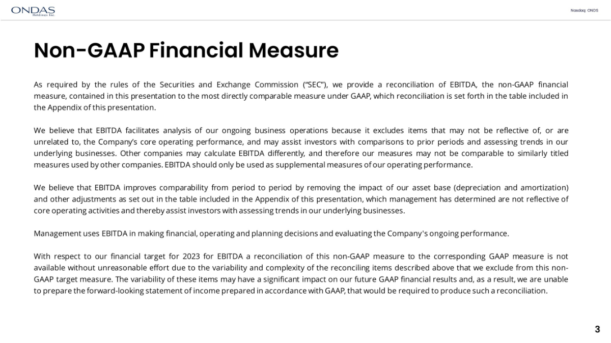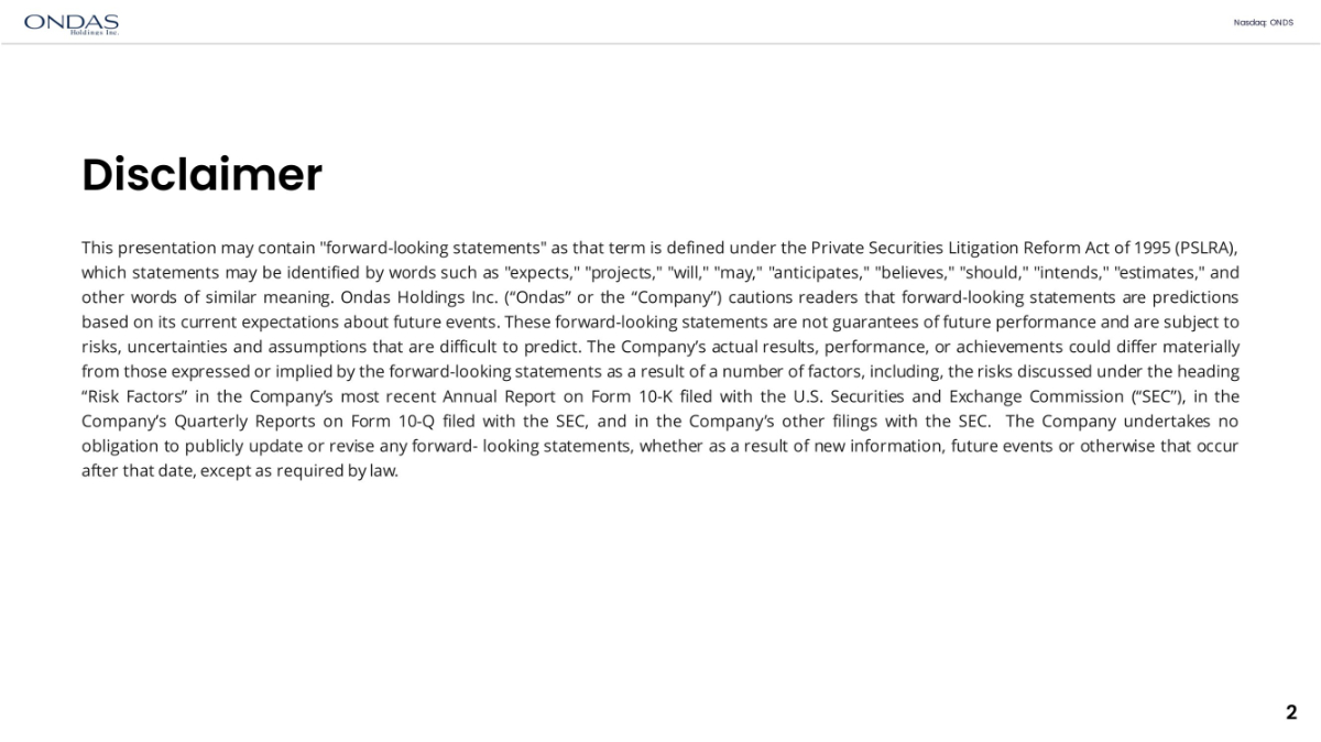 Nasdaq: ONDS This presentation may contain "forward - looking statements" as that term is defined under the Private Securities Litigation Reform Act of 1995 (PSLRA), which statements may be identified by words such as "expects," "projects," "will," "may," "anticipates," "believes," "should," "intends," "estimates," and other words of similar meaning . Ondas Holdings Inc . (“Ondas” or the “Company”) cautions readers that forward - looking statements are predictions based on its current expectations about future events . These forward - looking statements are not guarantees of future performance and are subject to risks, uncertainties and assumptions that are difficult to predict . The Company’s actual results, performance, or achievements could differ materially from those expressed or implied by the forward - looking statements as a result of a number of factors, including, the risks discussed under the heading “Risk Factors” in the Company’s most recent Annual Report on Form 10 - K filed with the U . S . Securities and Exchange Commission (“SEC”), in the Company’s Quarterly Reports on Form 10 - Q filed with the SEC, and in the Company’s other filings with the SEC . The Company undertakes no obligation to publicly update or revise any forward - looking statements, whether as a result of new information, future events or otherwise that occur after that date, except as required by law . 2 Disclaimer