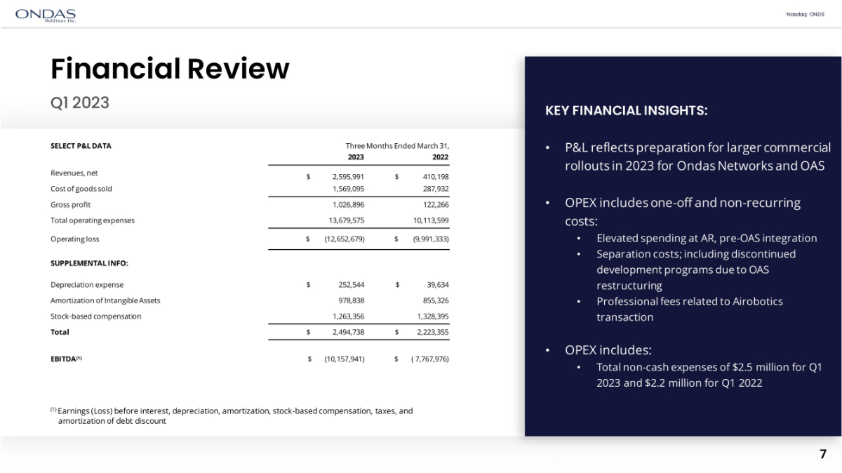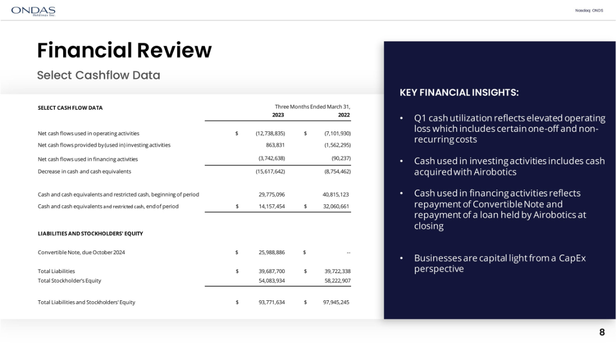 Nasdaq: ONDS 7 Q1 2023 Financial Review Placeholder KEY FINANCIAL INSIGHTS: • P&L reflects preparation for larger commercial rollouts in 2023 for Ondas Networks and OAS • OPEX includes one - off and non - recurring costs: • Elevated spending at AR, pre - OAS integration • Separation costs; including discontinued development programs due to OAS restructuring • Professional fees related to Airobotics transaction • OPEX includes: • Total non - cash expenses of $2.5 million for Q1 2023 and $2.2 million for Q1 2022 Three Months Ended March 31, SELECT P&L DATA 2022 2023 $ 410,198 $ 2,595,991 Revenues, net 287,932 1,569,095 Cost of goods sold 122,266 1,026,896 Gross profit 10,113,599 13,679,575 Total operating expenses $ (9,991,333) $ (12,652,679) Operating loss SUPPLEMENTAL INFO: $ 39,634 $ 252,544 Depreciation expense 855,326 978,838 Amortization of Intangible Assets 1,328,395 1,263,356 Stock - based compensation $ 2,223,355 $ 2,494,738 Total $ ( 7,767,976) $ (10,157,941) EBITDA (1) (1) Earnings (Loss) before interest, depreciation, amortization, stock - based compensation, taxes, and amortization of debt discount