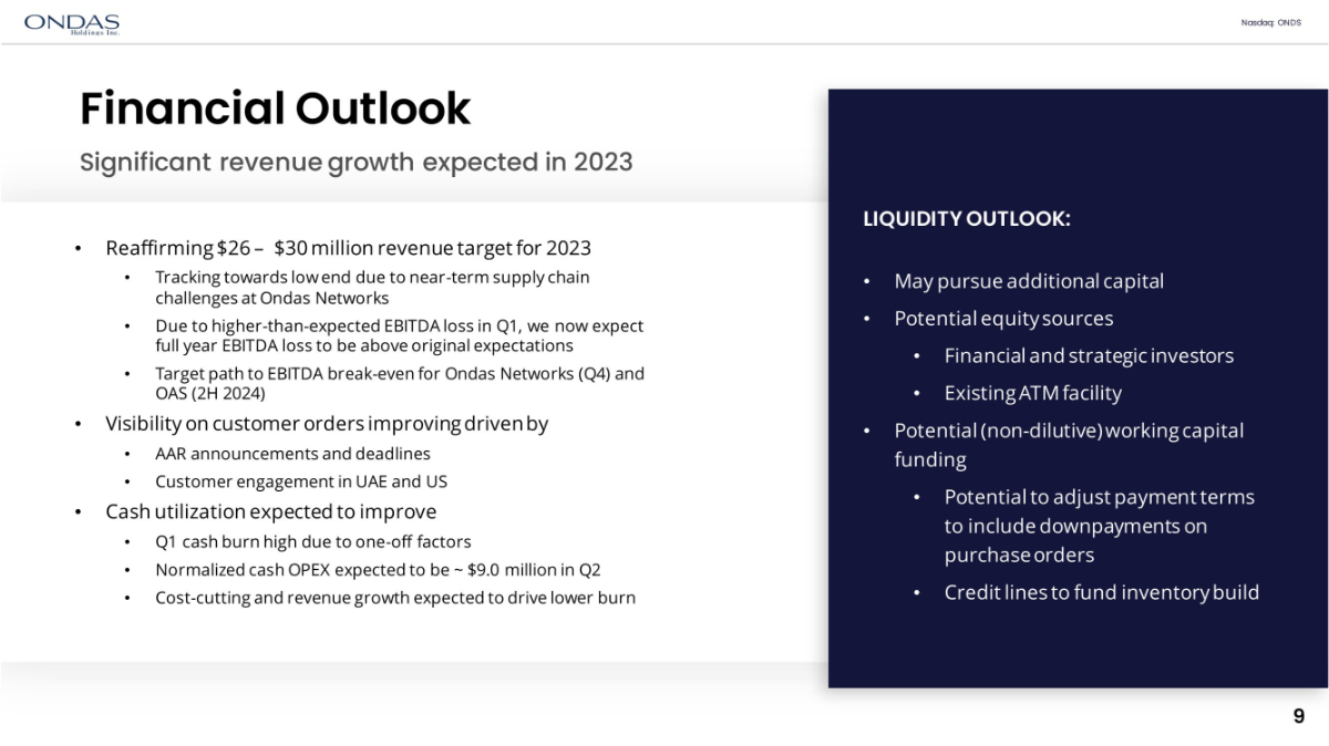 Nasdaq: ONDS Select Cashflow Data 8 Financial Review KEY FINANCIAL INSIGHTS: • Q1 cash utilization reflects elevated operating loss which includes certain one - off and non - recurring costs • Cash used in investing activities includes cash acquired with Airobotics • Cash used in financing activities reflects repayment of Convertible Note and repayment of a loan held by Airobotics at closing • Businesses are capital light from a CapEx perspective Three Months Ended March 31, SELECT CASH FLOW DATA 2022 2023 $ (7,101,930) $ (12,738,835) Net cash flows used in operating activities (1,562,295) 863,831 Net cash flows provided by (used in) investing activities (90,237) (3,742,638) Net cash flows used in financing activities (8,754,462) (15,617,642) Decrease in cash and cash equivalents 40,815,123 29,775,096 Cash and cash equivalents and restricted cash, beginning of period $ 32,060,661 $ 14,157,454 Cash and cash equivalents and restricted cash , end of period LIABILITIES AND STOCKHOLDERS' EQUITY $ - - $ 25,988,886 Convertible Note, due October 2024 $ 39,722,338 $ 39,687,700 Total Liabilities 58,222,907 54,083,934 Total Stockholder's Equity $ 97,945,245 $ 93,771,634 Total Liabilities and Stockholders' Equity