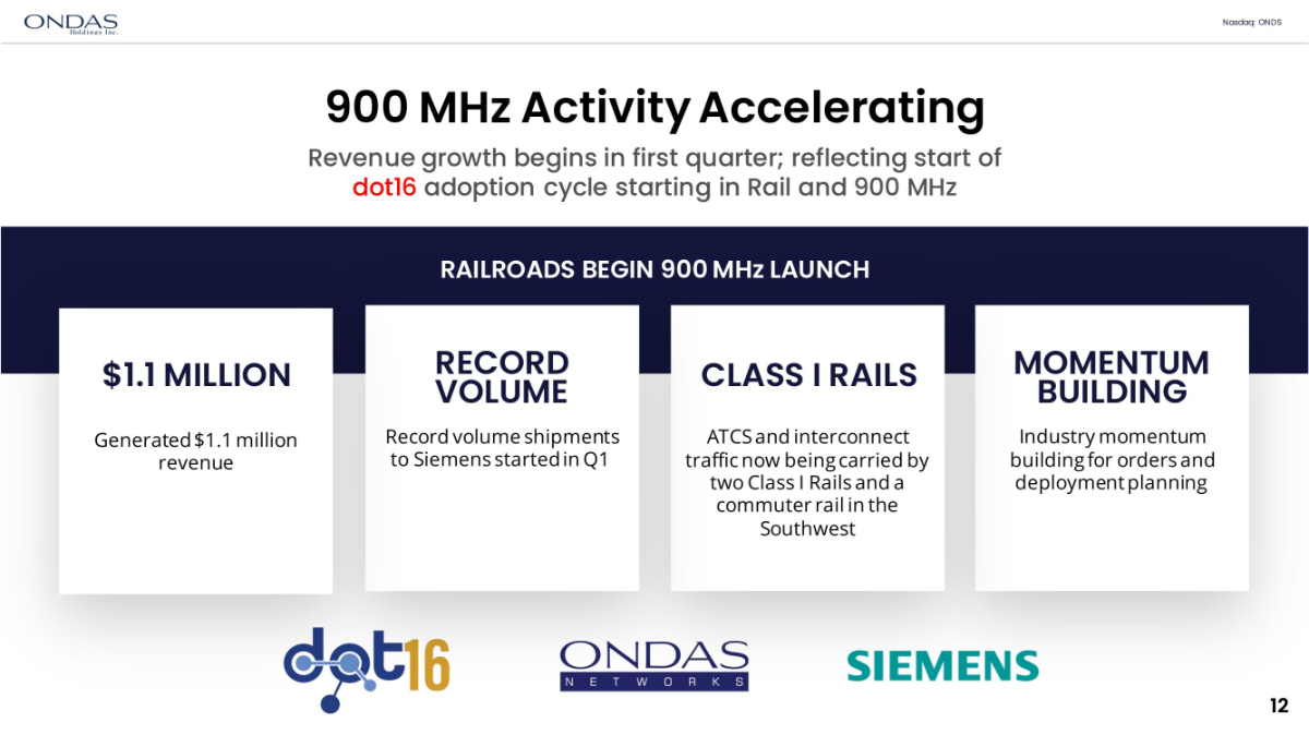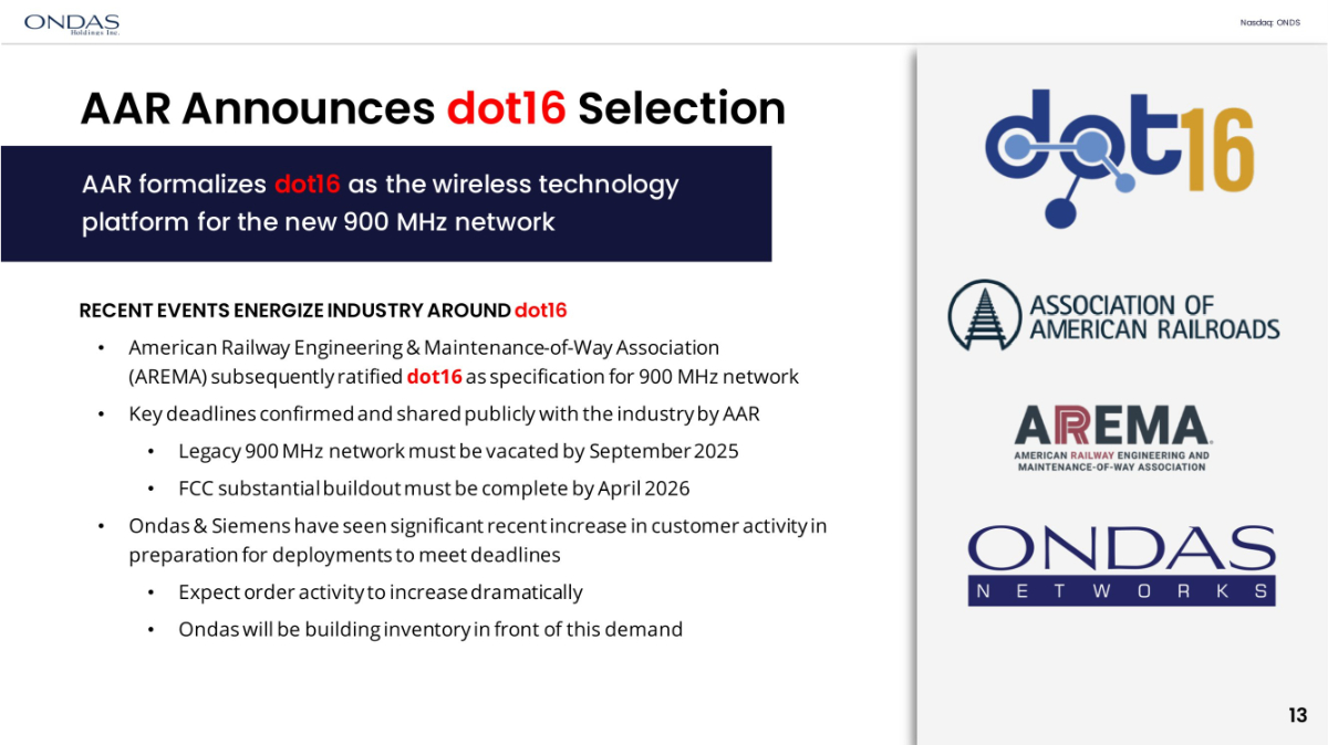 Nasdaq: ONDS 900 MHz Activity Accelerating Revenue growth begins in first quarter; reflecting start of dot16 adoption cycle starting in Rail and 900 MHz ATCS and interconnect traffic now being carried by two Class I Rails and a commuter rail in the Southwest Generated $1.1 million revenue 12 RAILROADS BEGIN 900 MHz LAUNCH $1.1 MILLION RECORD VOLUME Record volume shipments to Siemens started in Q1 CLASS I RAILS MOMENTUM BUILDING Industry momentum building for orders and deployment planning