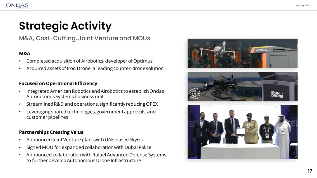 Nasdaq: ONDS M&A, Cost - Cutting, Joint Venture and MOUs M&A • Completed acquisition of Airobotics, developer of Optimus • Acquired assets of Iron Drone, a leading counter - drone solution Focused on Operational Efficiency • Integrated American Robotics and Airobotics to establish Ondas Autonomous Systems business unit • Streamlined R&D and operations, significantly reducing OPEX • Leveraging shared technologies, government approvals, and customer pipelines Partnerships Creating Value • Announced Joint Venture plans with UAE - based SkyGo • Signed MOU for expanded collaboration with Dubai Police • Announced collaboration with Rafael Advanced Defense Systems to further develop Autonomous Drone Infrastructure Strategic Activity 17