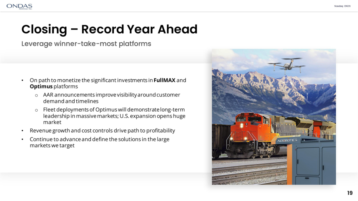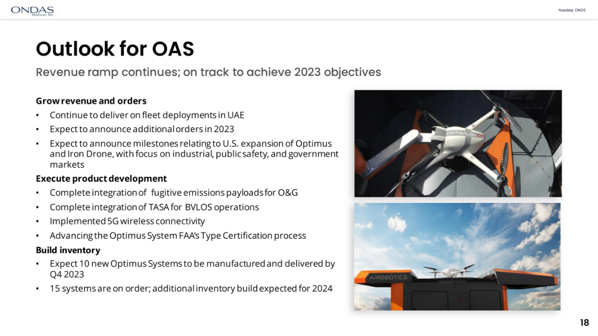 Nasdaq: ONDS Revenue ramp continues; on track to achieve 2023 objectives Grow revenue and orders • Continue to deliver on fleet deployments in UAE • Expect to announce additional orders in 2023 • Expect to announce milestones relating to U.S. expansion of Optimus and Iron Drone, with focus on industrial, public safety, and government markets Execute product development • Complete integration of fugitive emissions payloads for O&G • Complete integration of TASA for BVLOS operations • Implemented 5G wireless connectivity • Advancing the Optimus System FAA’s Type Certification process Build inventory • Expect 10 new Optimus Systems to be manufactured and delivered by Q4 2023 • 15 systems are on order; additional inventory build expected for 2024 Outlook for OAS 18