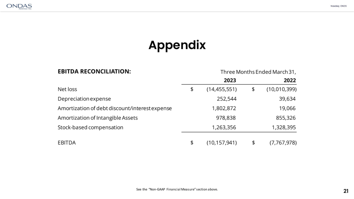 Nasdaq: ONDS Appendix 21 See the “Non - GAAP Financial Measure” section above. Three Months Ended March 31, EBITDA RECONCILIATION: 2022 2023 $ (10,010,399) $ (14,455,551) Net loss 39,634 252,544 Depreciation expense 19,066 1,802,872 Amortization of debt discount/interest expense 855,326 978,838 Amortization of Intangible Assets 1,328,395 1,263,356 Stock - based compensation $ (7,767,978) $ (10,157,941) EBITDA