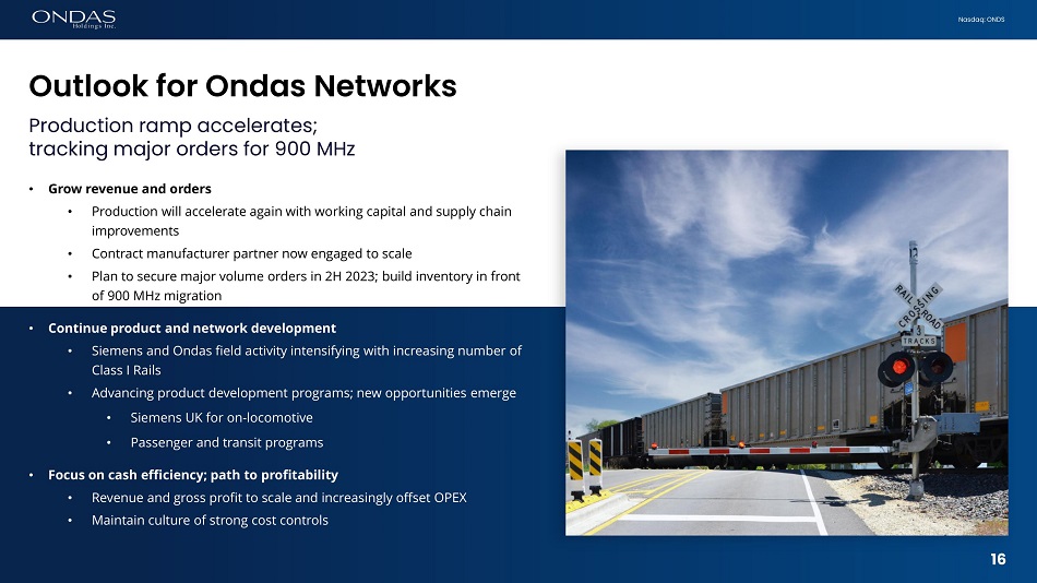 Nasdaq: ONDS Preparing for 900 MHz upgrade 15 2025 deadlines support expected order ramp • Ondas and Siemens engaged in field and purchasing groups • Rail operations teams (e.g., C&S groups) with budgets and responsibility for network operations • Initial deployments focused on critical network and high traffic locations, as well as new “vital communications” end points such as railroad crossings • Siemens negotiating orders; pricing and deployment plans being outlined • MxV Rail continues to advance dot16 integration • Network controller development • Expect engagement on other frequency bands • Scaling production; overcoming initial challenges • Component tightness due to phase 1 production startup is alleviating • Recent financing provides working capital for inventory build • Transitioned to contract manufacturer to increase production capacity
