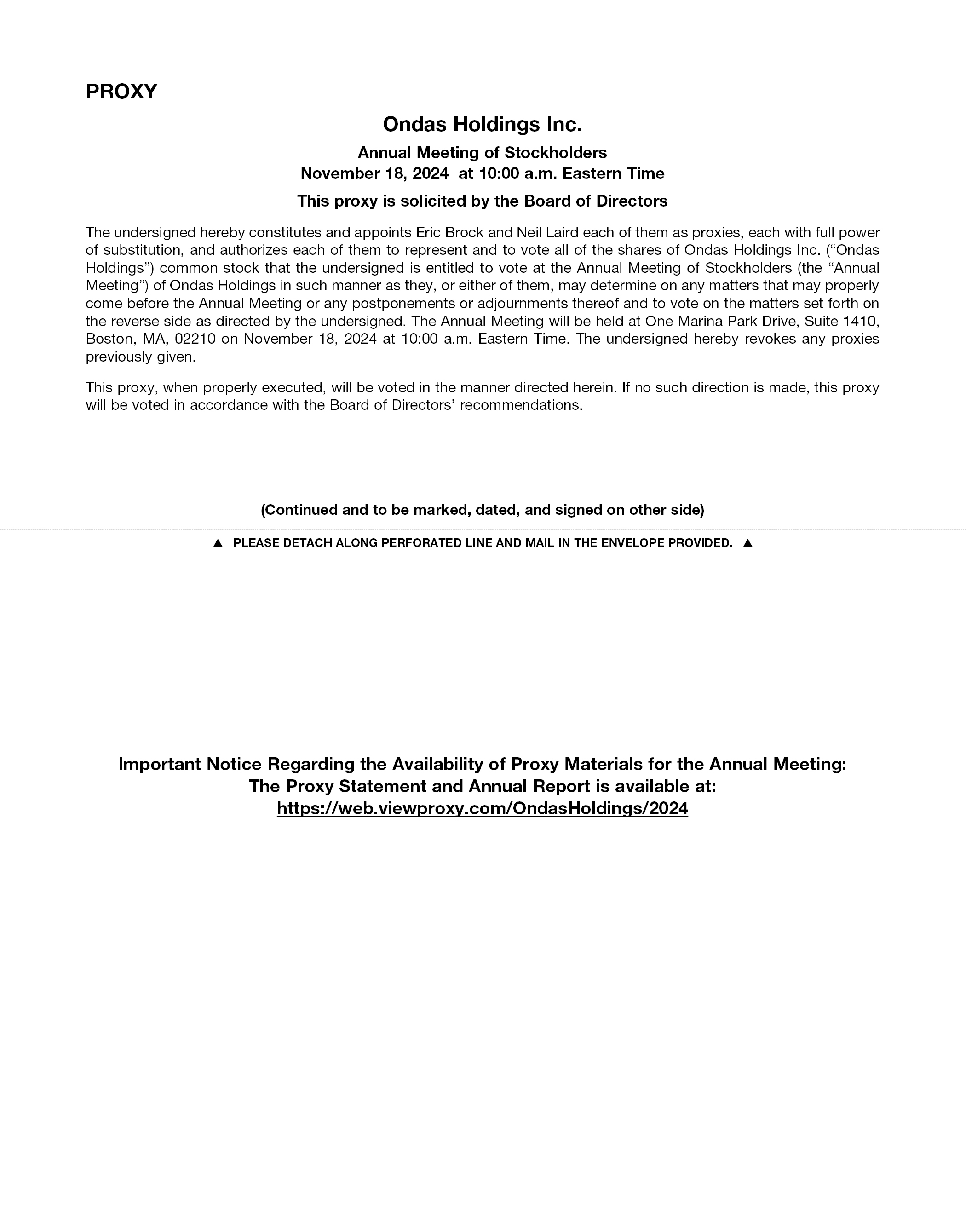 PROXY Ondas Holdings Inc. Annual Meeting of Stockholders November 18, 2024 at 10:00 a.m. Eastern Time This proxy is solicited by the Board of Directors The undersigned hereby constitutes and appoints Eric Brock and Neil Laird each of them as proxies, each with full power of substitution, and authorizes each of them to represent and to vote all of the shares of Ondas Holdings Inc. (“Ondas Holdings”) common stock that the undersigned is entitled to vote at the Annual Meeting of Stockholders (the “Annual Meeting”) of Ondas Holdings in such manner as they, or either of them, may determine on any matters that may properly come before the Annual Meeting or any postponements or adjournments thereof and to vote on the matters set forth on the reverse side as directed by the undersigned. The Annual Meeting will be held at the Marriott Boston Newton Hotel, 2345 Commonwealth Ave., Newton, MA 02466 on November 18, 2024 at 10:00 a.m. Eastern Time. The undersigned hereby revokes any proxies previously given. This proxy, when properly executed, will be voted in the manner directed herein. If no such direction is made, this proxy will be voted in accordance with the Board of Directors’ recommendations. (Continued and to be marked, dated, and signed on other side) PLEASE DETACH ALONG PERFORATED LINE AND MAIL IN THE ENVELOPE PROVIDED. Important Notice Regarding the Availability of Proxy Materials for the Annual Meeting: The Proxy Statement and Annual Report is available at: https://web.viewproxy.com/OndasHoldings/2024