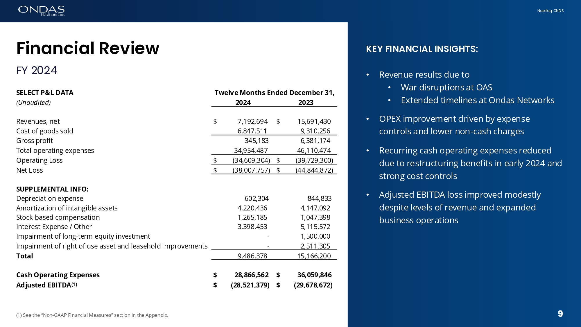 Nasdaq: ONDS KEY FINANCIAL INSIGHTS: 8 8 (1) See the “Non - GAAP Financial Measures” section in the Appendix. • P&L reflects early stage of initial platform adoption for Ondas Networks and OAS • Gross margin lower on product / services mix; expected to remain variable • OPEX improvement driven by strong expense controls and lower non - cash charges • Decline in recurring cash operating expenses due to strong cost controls despite expanded business activity • Adjusted EBITDA loss flat year - over - year Fifi6fici6l Review Q4 2024 Three Months Ended December 31, SELECT P&L DATA 2023 2024 (Unaudited) $ 4,961,285 $ 4,129,042 Revenues, net 3,233,661 3,245,542 Cost of goods sold 1,727,624 883,500 Gross profit 14,373,559 9,401,304 Total operating expenses $ (12,645,935) $ (8,517,804) Operating Loss $ (14,138,774) $ (10,335,669) Net Loss SUPPLEMENTAL INFO: 196,209 177,667 Depreciation expense 1,043,501 1,058,707 Amortization of intangible assets 411,048 276,502 Stock - based compensation 1,492,839 1,817,865 Interest Expense / Other 1,500,000 - Impairment of long - term equity investment 2,511,305 - Impairment of right of use asset and leasehold improvements 7,154,902 3,330,741 Total $ 8,711,496 $ 7,888,428 Cash Operating Expenses $ (6,983,872) $ (7,004,928) Adjusted EBITDA (1)