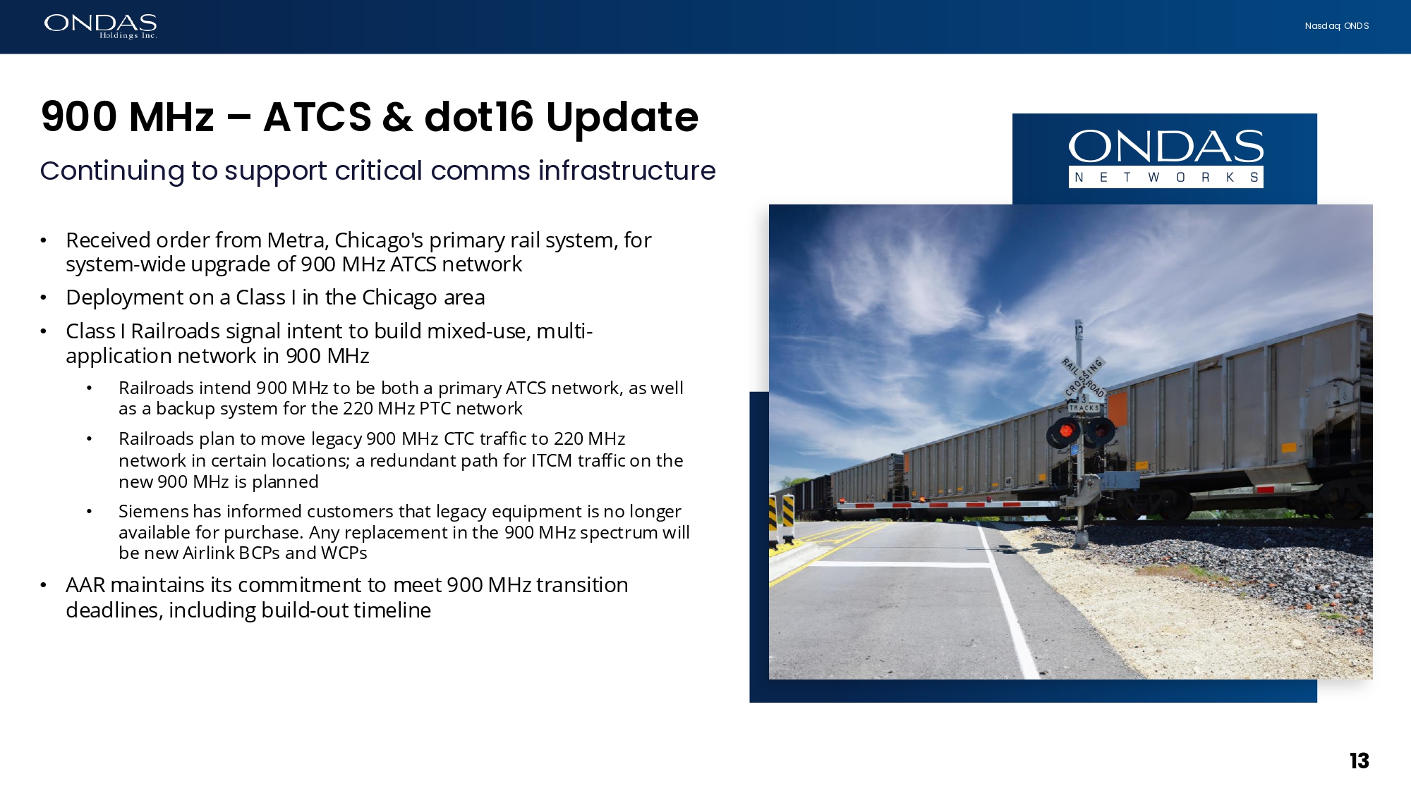 Nasdaq: ONDS 900 MHz – ATCS & dot16 Upd6te 13 Continuing to support critical comms infrastructure • Received order from Metra, Chicago's primary rail system, for system - wide upgrade of 900 MHz ATCS network • Deployment on a Class I in the Chicago area • Class I Railroads signal intent to build mixed - use, multi - application network in 900 MHz • Railroads intend 900 MHz to be both a primary ATCS network, as well as a backup system for the 220 MHz PTC network • Railroads plan to move legacy 900 MHz CTC traffic to 220 MHz network in certain locations; a redundant path for ITCM traffic on the new 900 MHz is planned • Siemens has informed customers that legacy equipment is no longer available for purchase. Any replacement in the 900 MHz spectrum will be new Airlink BCPs and WCPs • AAR maintains its commitment to meet 900 MHz transition deadlines, including build - out timeline