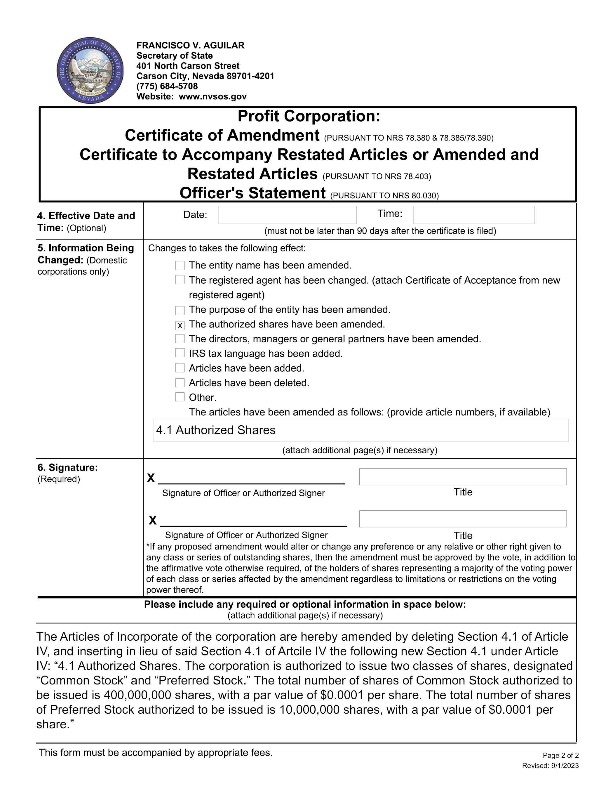 FRANCISCO V. AGUILAR Secretary of State 401 North Carson Street Carson City, Nevada 89701-4201 (775) 684-5708 Website: www.nvsos.gov Profit Corporation: Certificate of Amendment (PURSUANT TO NRS 78.380 & 78.385/78.390) Certificate to Accompany Restated Articles or Amended and Restated Articles (PURSUANT TO NRS 78.403) Officer’s Statement (PURSUANT TO NRS 80.030) 4.Effective Date and Time: (Optional) Time: Date: (must not be later than 90 days after the certificate is filed) 5.Information Being Changed: (Domestic The corporations only) Changes to takes the following effect: The entity name has been amended. The registered agent has been changed. (attach Certificate of Acceptance from new registered agent) The purpose of the entity has been amended. The authorized shares have been amended. The directors, managers or general partners have been amended. IRS tax language has been added. Articles have been added. Articles have been deleted. Other. The articles have been amended as follows: (provide article numbers, if available) 4.1 Authorized Shares (attach additional page(s) if necessary) 6.Signature:(Required X Signature of Officer or Authorized Signer Title X Signature of Officer or Authorized Signer Title *If any proposed amendment would alter or change any preference or any relative or other right given to any class or series of outstanding shares, then the amendment must be approved by the vote, in addition to the affirmative vote otherwise required, of the holders of shares representing a majority of the voting power of each class or series affected by the amendment regardless to limitations or restrictions on the voting power thereof. Please include any required or optional information in space below: (attach additional page(s) if necessary) The Articles of Incorporate of the corporation are hereby amended by deleting Section 4.1 of Article IV, and inserting in lieu of said Section 4.1 of Artcile IV the following new Section 4.1 under Article IV: “4.1 Authorized Shares. The corporation is authorized to issue two classes of shares, designated “Common Stock” and “Preferred Stock.” The total number of shares of Common Stock authorized to be issued is 400,000,000 shares, with a par value of $0.0001 per share. The total number of shares of Preferred Stock authorized to be issued is 10,000,000 shares, with a par value of $0.0001 per share.” This form must be accompanied by appropriate fees.