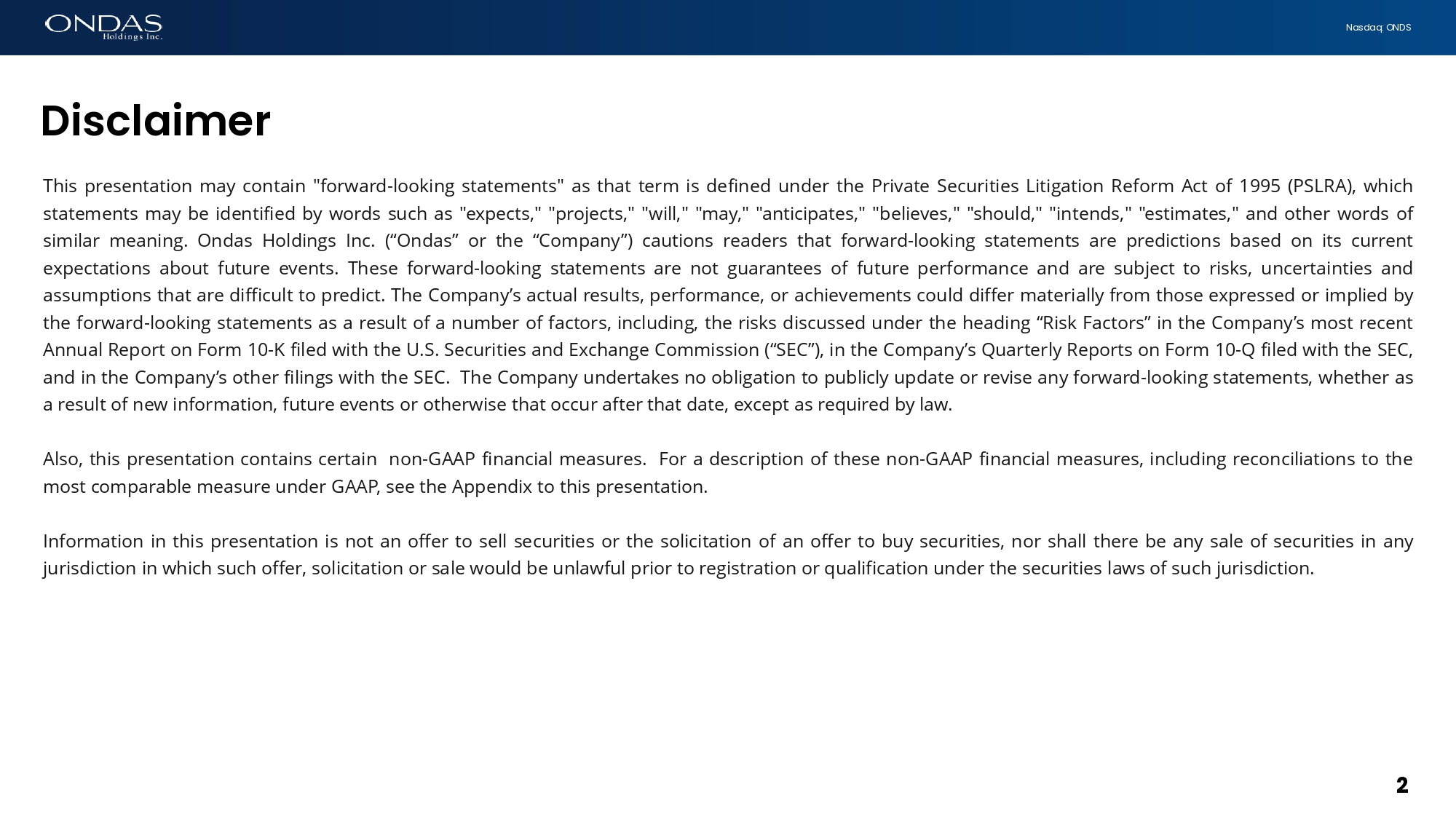 2 Nasdaq: ONDS This presentation may contain "forward - looking statements" as that term is defined under the Private Securities Litigation Reform Act of 1995 (PSLRA), which statements may be identified by words such as "expects," "projects," "will," "may," "anticipates," "believes," "should," "intends," "estimates," and other words of similar meaning . Ondas Holdings Inc . (“Ondas” or the “Company”) cautions readers that forward - looking statements are predictions based on its current expectations about future events . These forward - looking statements are not guarantees of future performance and are subject to risks, uncertainties and assumptions that are difficult to predict . The Company’s actual results, performance, or achievements could differ materially from those expressed or implied by the forward - looking statements as a result of a number of factors, including, the risks discussed under the heading “Risk Factors” in the Company’s most recent Annual Report on Form 10 - K filed with the U . S . Securities and Exchange Commission (“SEC”), in the Company’s Quarterly Reports on Form 10 - Q filed with the SEC, and in the Company’s other filings with the SEC . The Company undertakes no obligation to publicly update or revise any forward - looking statements, whether as a result of new information, future events or otherwise that occur after that date, except as required by law . Also, this presentation contains certain non - GAAP financial measures . For a description of these non - GAAP financial measures, including reconciliations to the most comparable measure under GAAP, see the Appendix to this presentation . Information in this presentation is not an offer to sell securities or the solicitation of an offer to buy securities, nor shall there be any sale of securities in any jurisdiction in which such offer, solicitation or sale would be unlawful prior to registration or qualification under the securities laws of such jurisdiction . Discl6imer