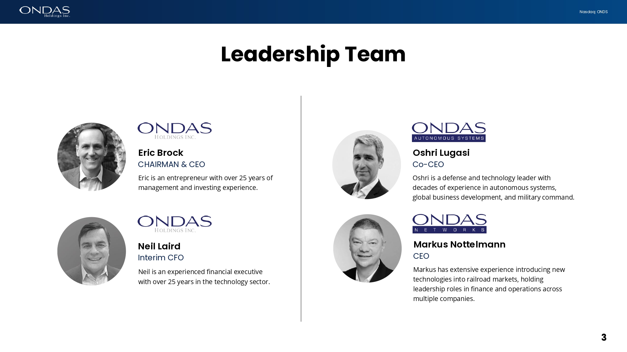 3 Nasdaq: ONDS Eric Brock CHAIRMAN & CEO Eric is an entrepreneur with over 25 years of management and investing experience. Neil L6ird Interim CFO Neil is an experienced financial executive with over 25 years in the technology sector. Oshri Lug6si Co - CEO Oshri is a defense and technology leader with decades of experience in autonomous systems, global business development, and military command. M6rkus Nottelm6fifi CEO Markus has extensive experience introducing new technologies into railroad markets, holding leadership roles in finance and operations across multiple companies. Leadership Team