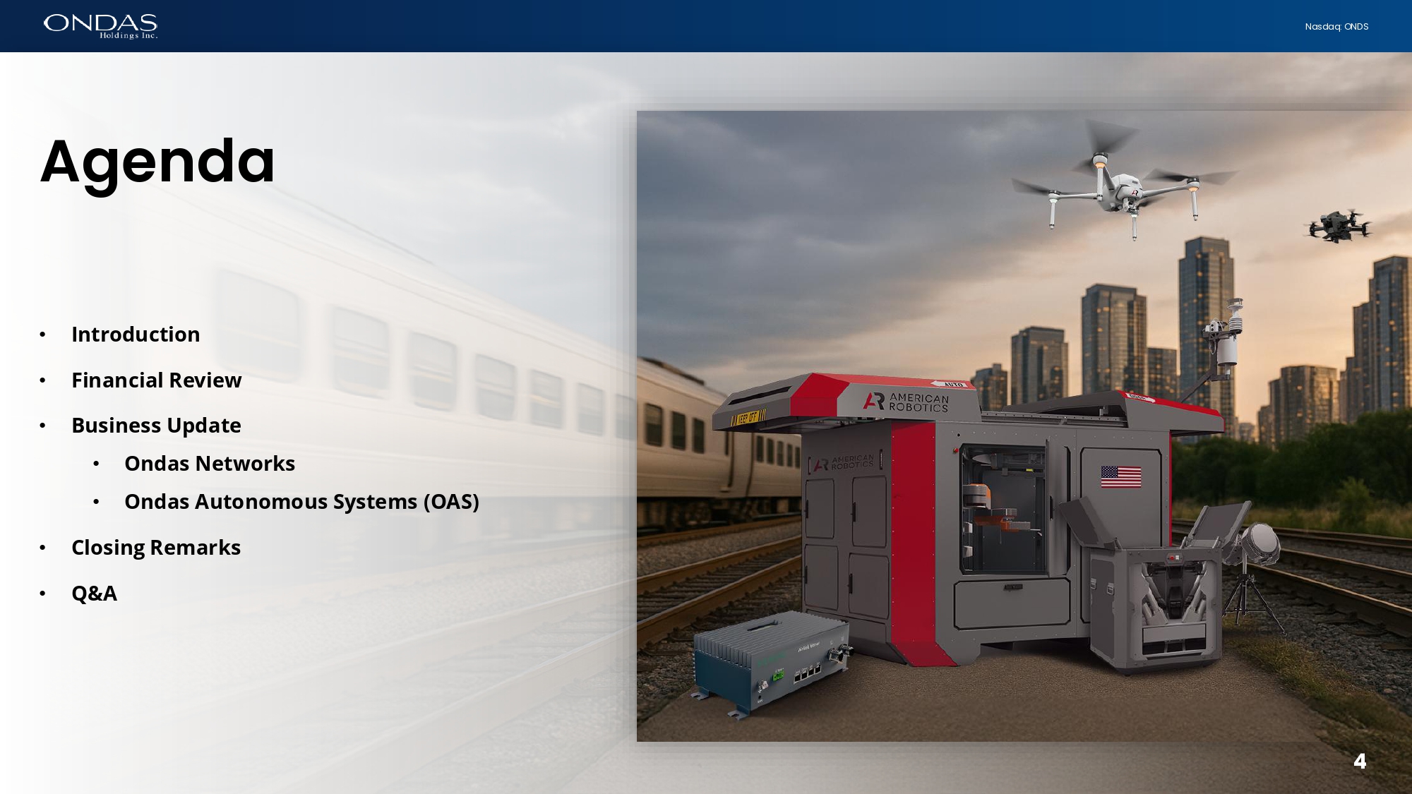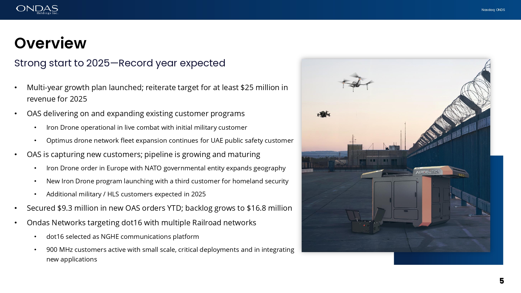 4 Nasdaq: ONDS Agefid6 • Introduction • Financial Review • Business Update • Ondas Networks • Ondas Autonomous Systems (OAS) • Closing Remarks • Q&A 4