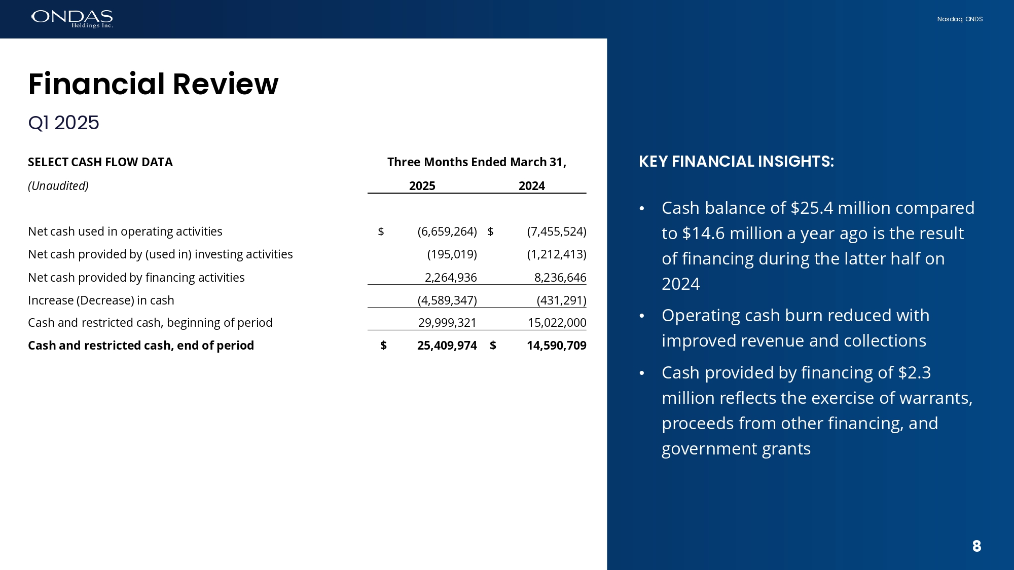 7 Nasdaq: ONDS KEY FINANCIAL INSIGHTS: • P&L reflects early stage of initial platform adoption for OAS and Ondas Networks • 580% increase in revenues • Gross margin improved, yet still sub - scale due to low sales volumes and revenue mix • Cash operating expenses increased due to additional investment to scale OAS operations in support of increased revenue expectations • Adjusted EBITDA loss slightly improved year - over - year (1) See the “Non - GAAP Financial Measures” section in the Appendix. Fifi6fici6l Review Q1 2025 7 Three Months Ended March 31, SELECT P&L DATA 2024 2025 (Unaudited) $ 625,009 $ 4,248,182 Revenues, net 1,019,991 2,759,632 Cost of goods sold (394,982) 1,488,550 Gross profit 8,732,213 11,798,988 Total operating expenses $ (9,127,195) $ (10,310,438) Operating Loss $ (9,876,084) $ (14,136,350) Net Loss SUPPLEMENTAL INFO: 123,071 180,709 Depreciation expense 1,052,211 1,061,869 Amortization of intangible assets 269,553 1,572,645 Stock - based compensation 748,889 3,825,912 Other expense, net 2,193,724 6,641,135 Total $ 7,287,378 $ 8,983,765 Cash Operating Expenses (1) $ (7,682,360) $ (7,495,215) Adjusted EBITDA (1)