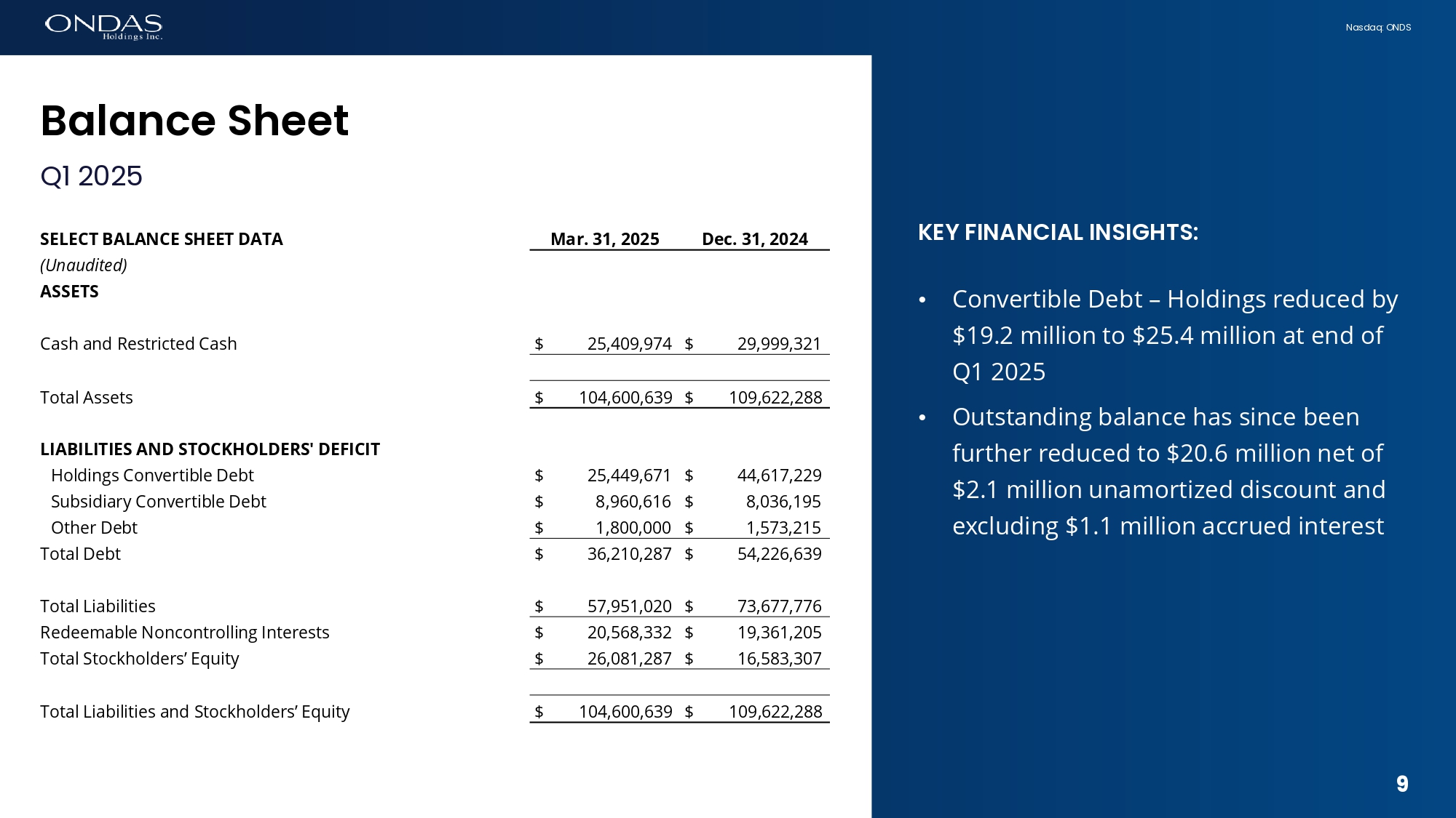 8 Nasdaq: ONDS Fifi6fici6l Review Q1 2025 8 Three Months Ended March 31, SELECT CASH FLOW DATA 2024 2025 (Unaudited) $ (7,455,524) $ (6,659,264) Net cash used in operating activities (1,212,413) (195,019) Net cash provided by (used in) investing activities 8,236,646 2,264,936 Net cash provided by financing activities (431,291) (4,589,347) Increase (Decrease) in cash 15,022,000 29,999,321 Cash and restricted cash, beginning of period $ 14,590,709 $ 25,409,974 Cash and restricted cash, end of period KEY FINANCIAL INSIGHTS: • Cash balance of $25.4 million compared to $14.6 million a year ago is the result of financing during the latter half on 2024 • Operating cash burn reduced with improved revenue and collections • Cash provided by financing of $2.3 million reflects the exercise of warrants, proceeds from other financing, and government grants