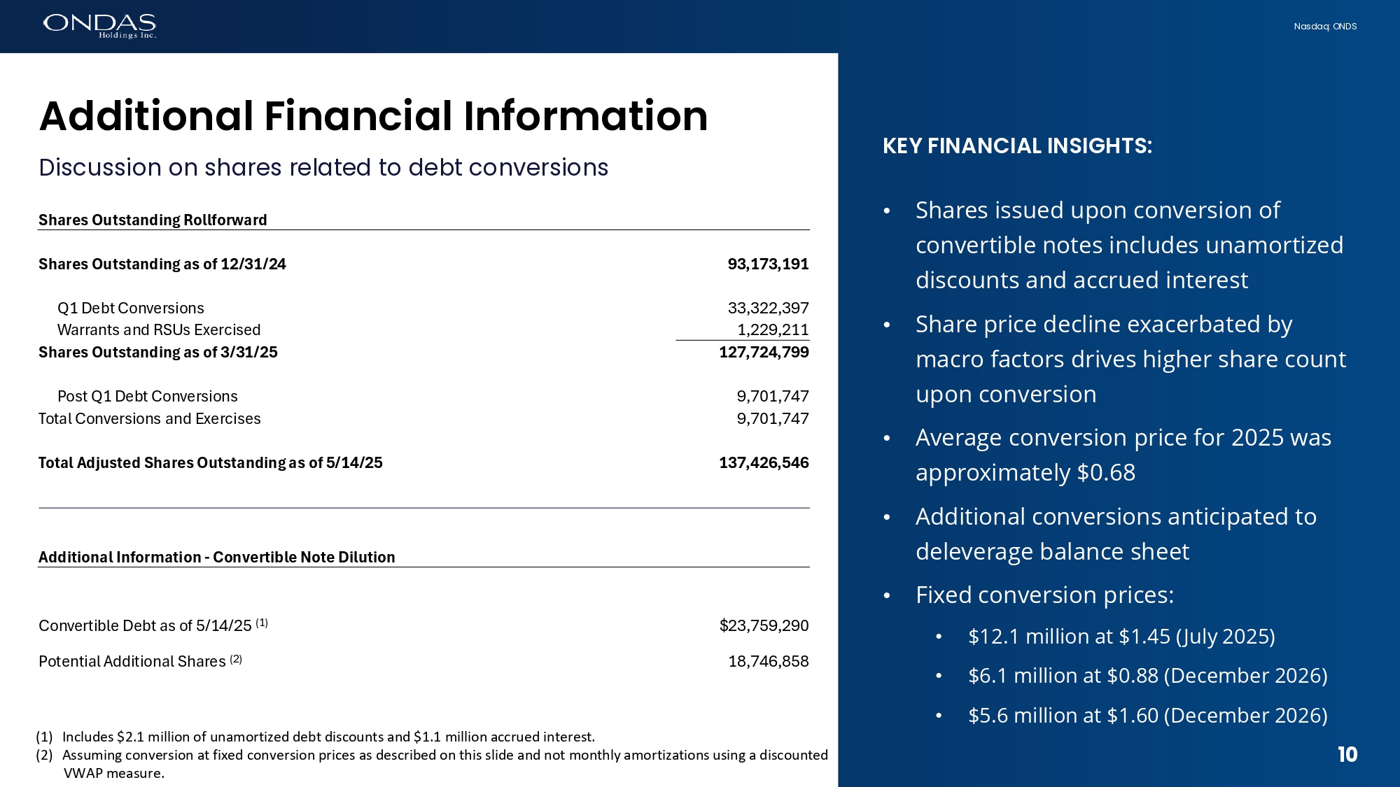 9 Nasdaq: ONDS KEY FINANCIAL INSIGHTS: • Convertible Debt – Holdings reduced by $19.2 million to $25.4 million at end of Q1 2025 • Outstanding balance has since been further reduced to $20.6 million net of $2.1 million unamortized discount and excluding $1.1 million accrued interest 9 B6l6fice Sheet Q1 2025 Dec. 31, 2024 Mar. 31, 2025 SELECT BALANCE SHEET DATA (Unaudited) ASSETS $ 29,999,321 $ 25,409,974 Cash and Restricted Cash $ 109,622,288 $ 104,600,639 Total Assets LIABILITIES AND STOCKHOLDERS' DEFICIT $ 44,617,229 $ 25,449,671 Holdings Convertible Debt $ 8,036,195 $ 8,960,616 Subsidiary Convertible Debt $ 1,573,215 $ 1,800,000 Other Debt $ 54,226,639 $ 36,210,287 Total Debt $ 73,677,776 $ 57,951,020 Total Liabilities $ 19,361,205 $ 20,568,332 Redeemable Noncontrolling Interests $ 16,583,307 $ 26,081,287 Total Stockholders’ Equity $ 109,622,288 $ 104,600,639 Total Liabilities and Stockholders’ Equity