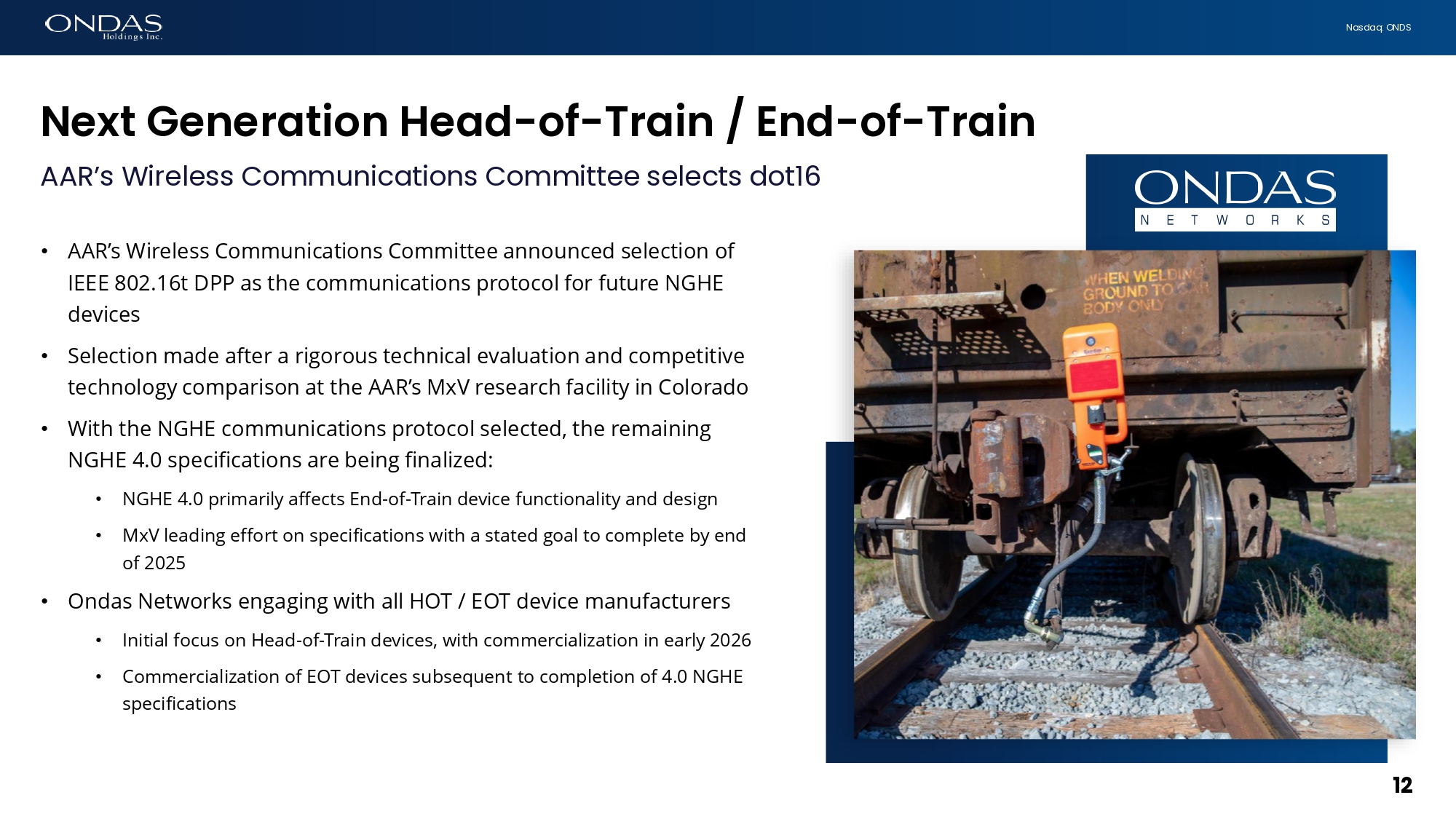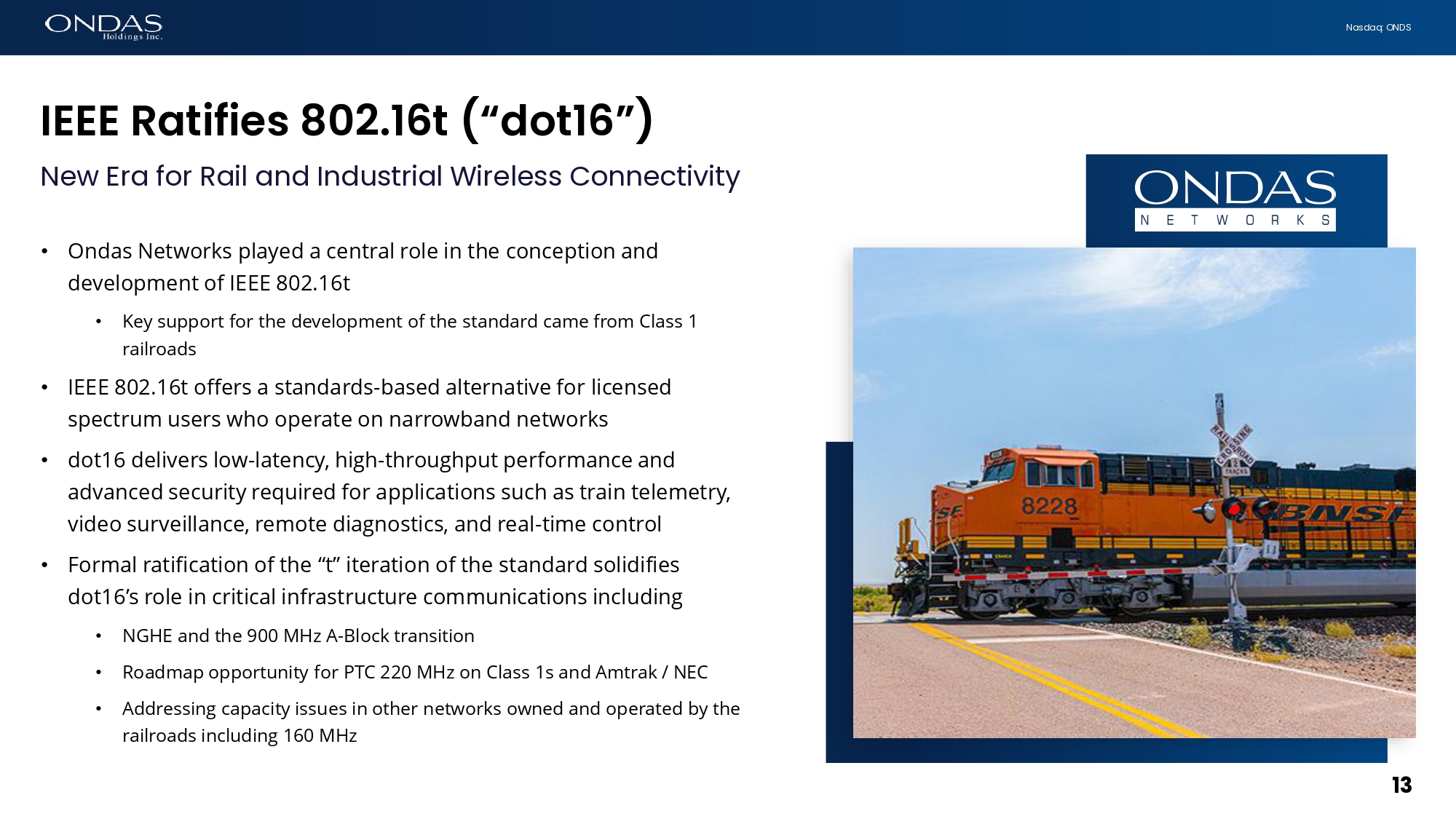 12 Nasdaq: ONDS Next Gefier6tiofi He6d - of - Tr6ifi / Efid - of - Tr6ifi AAR’s Wireless Communications Committee selects dot16 • AAR’s Wireless Communications Committee announced selection of IEEE 802.16t DPP as the communications protocol for future NGHE devices • Selection made after a rigorous technical evaluation and competitive technology comparison at the AAR’s MxV research facility in Colorado • With the NGHE communications protocol selected, the remaining NGHE 4.0 specifications are being finalized: • NGHE 4.0 primarily affects End - of - Train device functionality and design • MxV leading effort on specifications with a stated goal to complete by end of 2025 • Ondas Networks engaging with all HOT / EOT device manufacturers • Initial focus on Head - of - Train devices, with commercialization in early 2026 • Commercialization of EOT devices subsequent to completion of 4.0 NGHE specifications