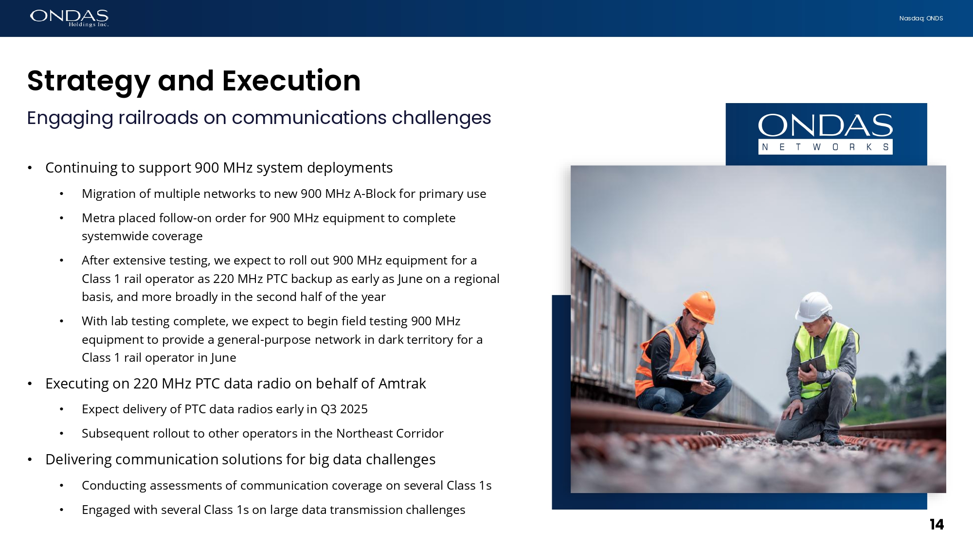 13 Nasdaq: ONDS IEEE Ratifies 802.16t (“dot16”) New Era for Rail and Industrial Wireless Connectivity • Ondas Networks played a central role in the conception and development of IEEE 802.16t • Key support for the development of the standard came from Class 1 railroads • IEEE 802.16t offers a standards - based alternative for licensed spectrum users who operate on narrowband networks • dot16 delivers low - latency, high - throughput performance and advanced security required for applications such as train telemetry, video surveillance, remote diagnostics, and real - time control • Formal ratification of the “t” iteration of the standard solidifies dot16’s role in critical infrastructure communications including • NGHE and the 900 MHz A - Block transition • Roadmap opportunity for PTC 220 MHz on Class 1s and Amtrak / NEC • Addressing capacity issues in other networks owned and operated by the railroads including 160 MHz