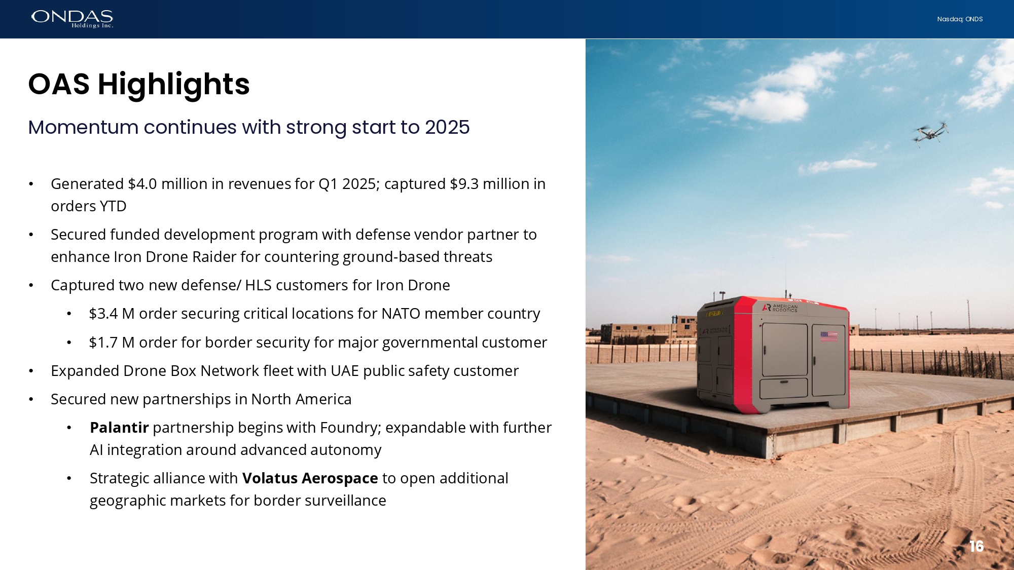 First Qu6rter 2025 E6rfiifigs Rele6se Copyright 2025. All rights reserved. NASDAQ: ONDS | May 15, 2025