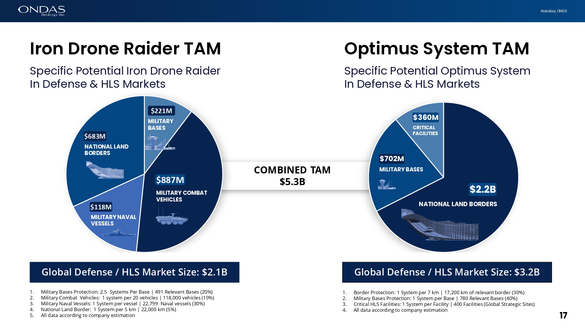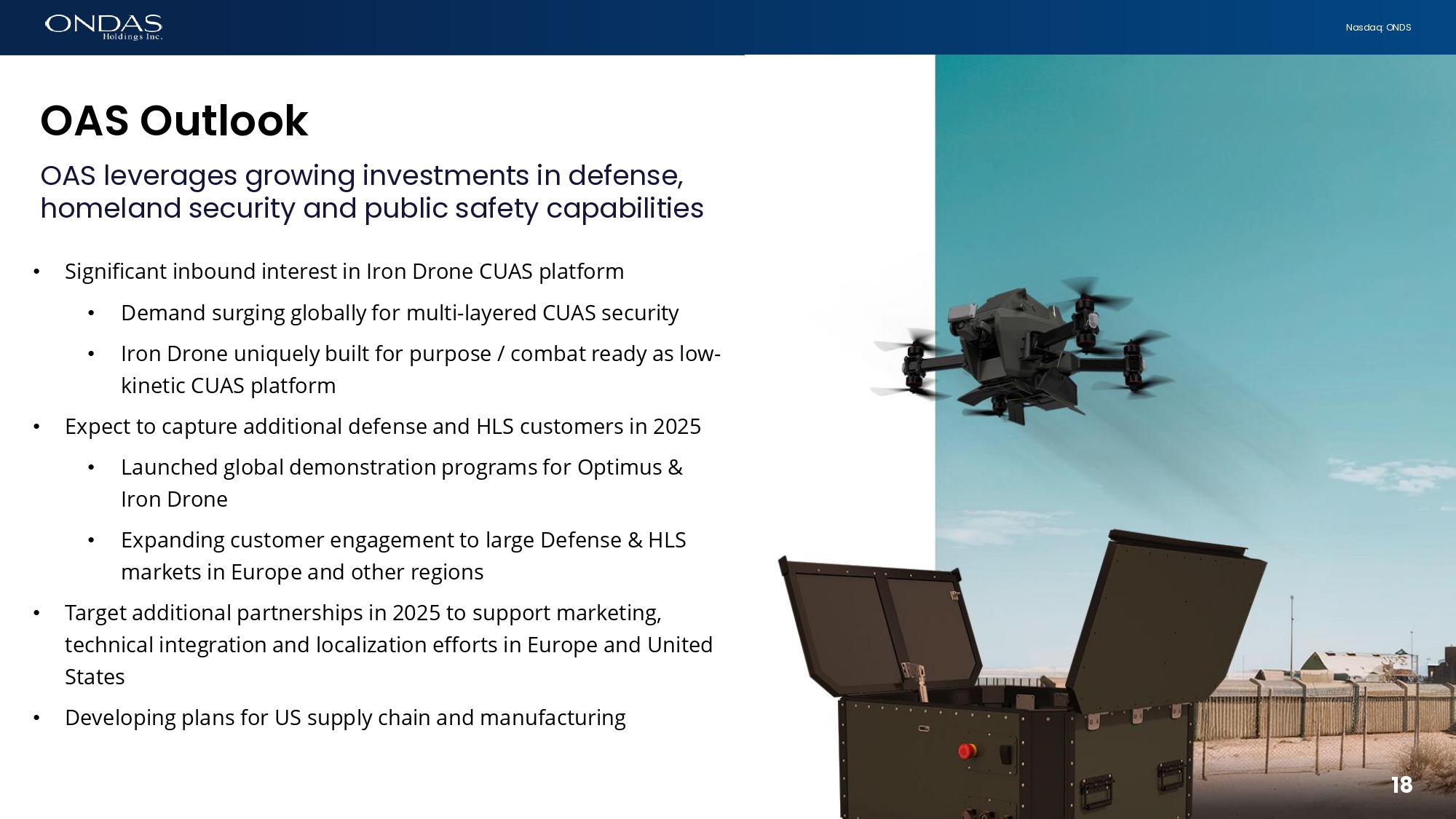 17 Nasdaq: ONDS COMBINED TAM $5.3B $2.2B NATIONAL LAND BORDERS MILITARY BASES $702M $360M CRITICAL FACILITIES Irofi Drofie R6ider TAM Specific Potential Iron Drone Raider In Defense & HLS Markets 1. Military Bases Protection: 2.5 Systems Per Base | 491 Relevant Bases (20%) 2. Military Combat Vehicles: 1 system per 20 vehicles | 118,000 vehicles (10%) 3. Military Naval Vessels: 1 System per vessel | 22,799 Naval vessels (30%) 4. National Land Border: 1 System per 5 km | 22,000 km (5%) 5. All data according to company estimation Global Defense / HLS Market Size: $2.1B 1. Border Protection: 1 System per 7 km | 17,200 km of relevant border (30%) 2. Military Bases Protection: 1 System per Base | 780 Relevant Bases (40%) 3. Critical HLS Facilities: 1 System per Facility | 400 Facilities (Global Strategic Sites) 4. All data according to company estimation Global Defense / HLS Market Size: $3.2B Optimus System TAM Specific Potential Optimus System In Defense & HLS Markets $683M NATIONAL LAND BORDERS $887M MILITARY COMBAT VEHICLES $221M MILITARY BASES $118M MILITARY NAVAL VESSELS
