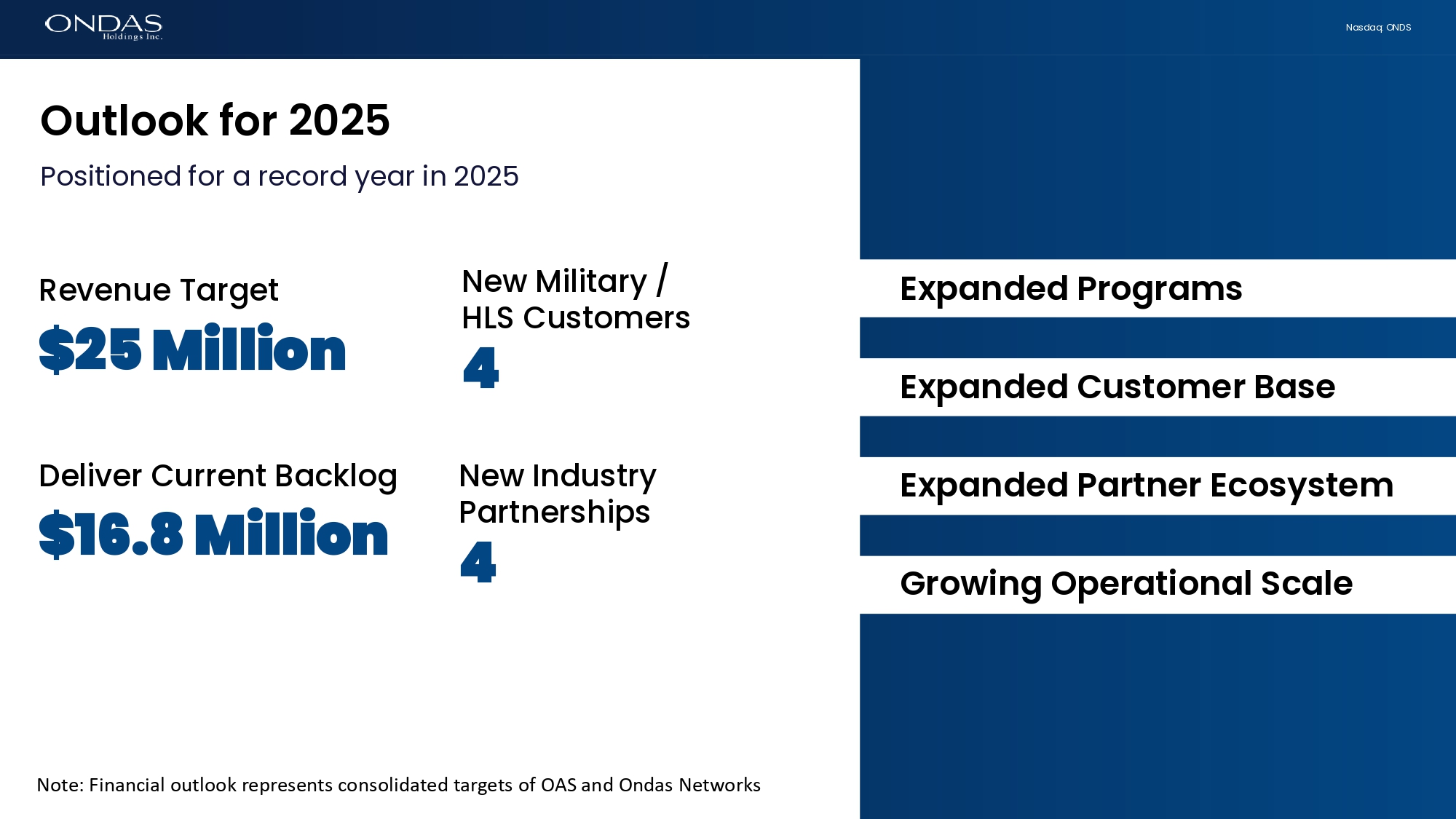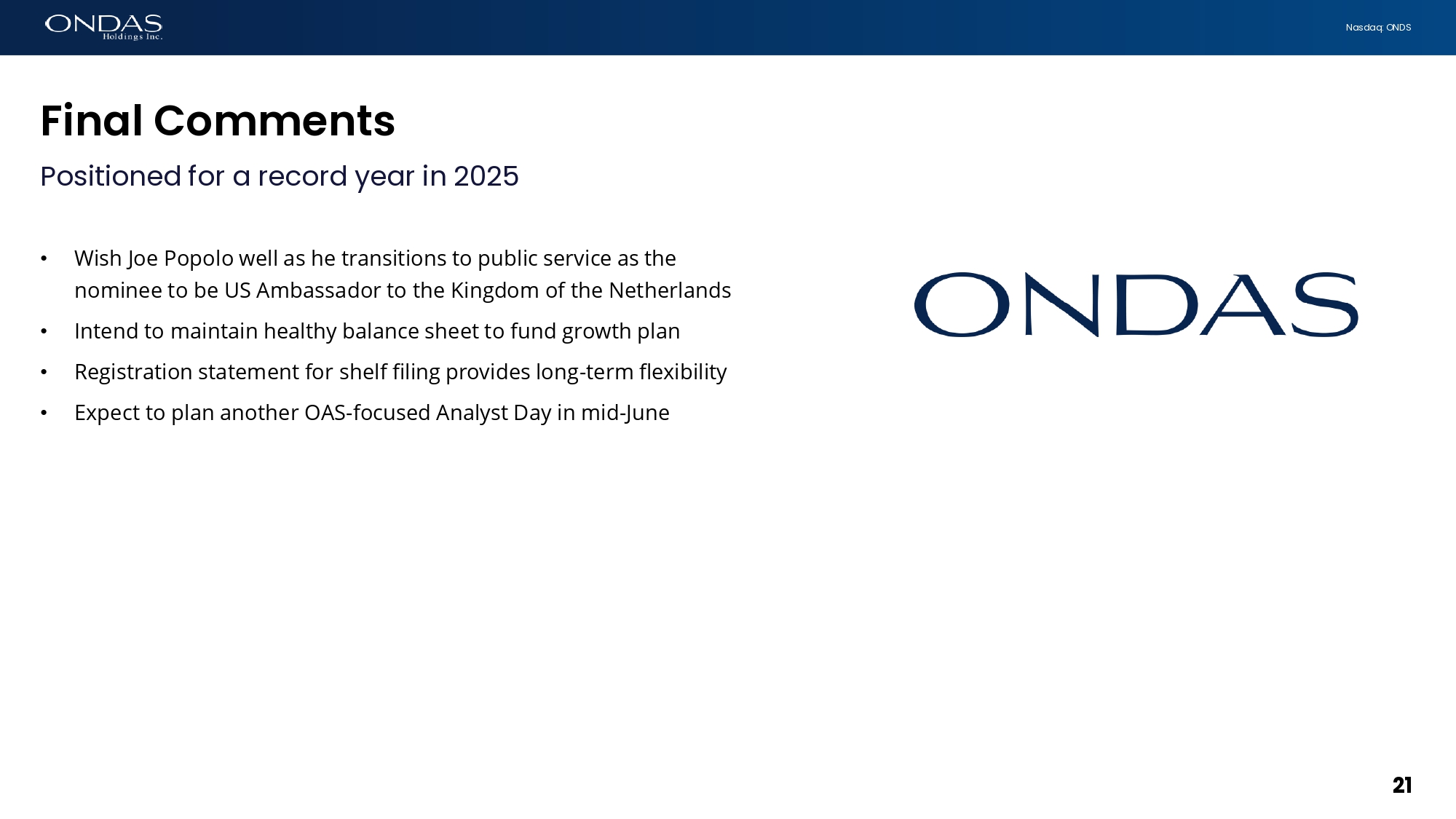21 Nasdaq: ONDS Fifi6l Commefits Positioned for a record year in 2025 • Wish Joe Popolo well as he transitions to public service as the nominee to be US Ambassador to the Kingdom of the Netherlands • Intend to maintain healthy balance sheet to fund growth plan • Registration statement for shelf filing provides long - term flexibility • Expect to plan another OAS - focused Analyst Day in mid - June