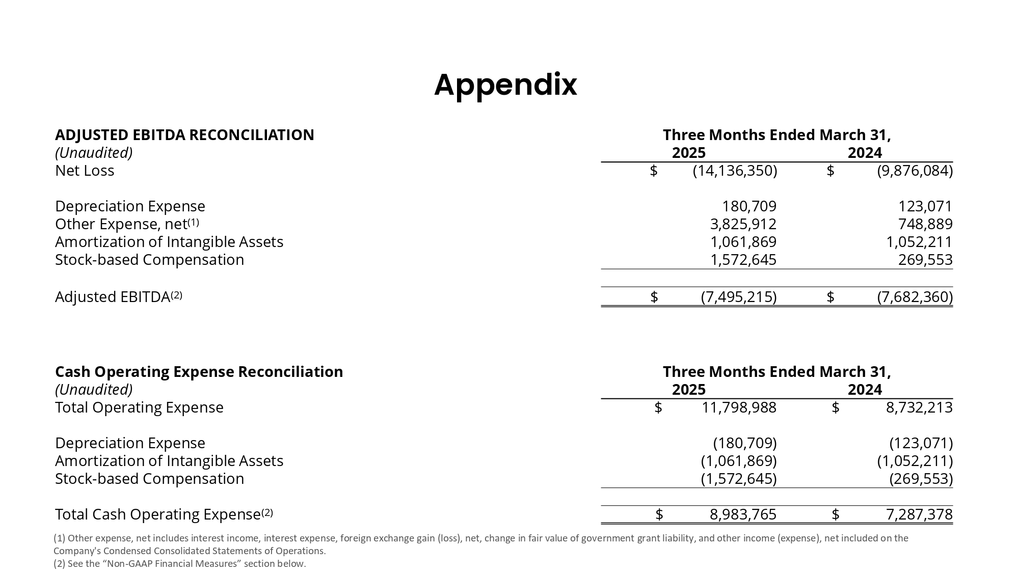 (1) Other expense, net includes interest income, interest expense, foreign exchange gain (loss), net, change in fair value of government grant liability, and other income (expense), net included on the Company's Condensed Consolidated Statements of Operations. (2) See the “Non - GAAP Financial Measures” section below. Appefidix Three Months Ended March 31, ADJUSTED EBITDA RECONCILIATION 2024 2025 (Unaudited) $ (9,876,084) $ (14,136,350) Net Loss 123,071 180,709 Depreciation Expense 748,889 3,825,912 Other Expense, net (1) 1,052,211 1,061,869 Amortization of Intangible Assets 269,553 1,572,645 Stock - based Compensation $ (7,682,360) $ (7,495,215) Adjusted EBITDA (2) Three Months Ended March 31, Cash Operating Expense Reconciliation 2024 2025 (Unaudited) $ 8,732,213 $ 11,798,988 Total Operating Expense (123,071) (180,709) Depreciation Expense (1,052,211) (1,061,869) Amortization of Intangible Assets (269,553) (1,572,645) Stock - based Compensation $ 7,287,378 $ 8,983,765 Total Cash Operating Expense (2)