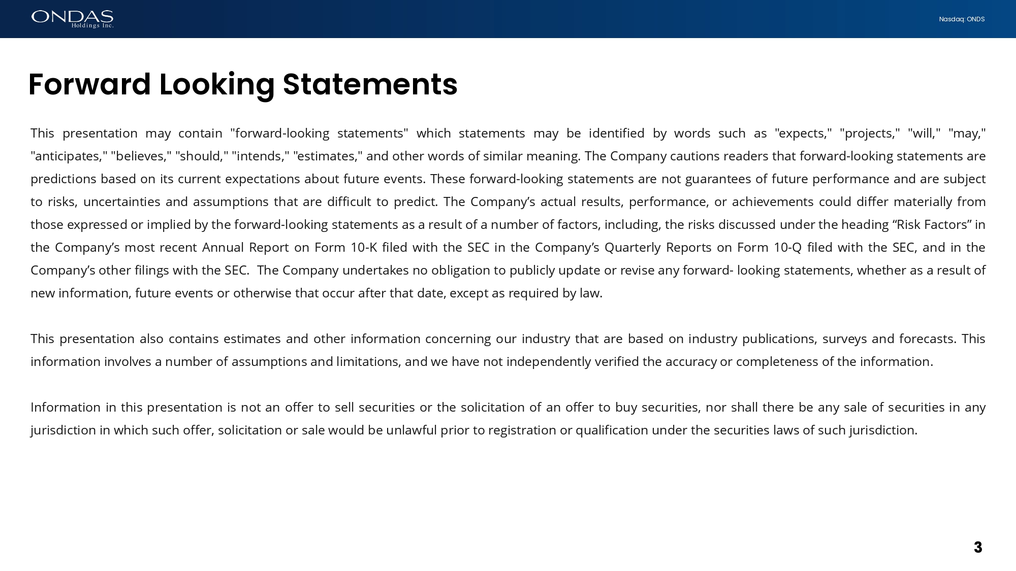 3 Nasdaq: ONDS This presentation may contain "forward - looking statements" which statements may be identified by words such as "expects," "projects," "will," "may," "anticipates," "believes," "should," "intends," "estimates," and other words of similar meaning . The Company cautions readers that forward - looking statements are predictions based on its current expectations about future events . These forward - looking statements are not guarantees of future performance and are subject to risks, uncertainties and assumptions that are difficult to predict . The Company’s actual results, performance, or achievements could differ materially from those expressed or implied by the forward - looking statements as a result of a number of factors, including, the risks discussed under the heading “Risk Factors” in the Company’s most recent Annual Report on Form 10 - K filed with the SEC in the Company’s Quarterly Reports on Form 10 - Q filed with the SEC, and in the Company’s other filings with the SEC . The Company undertakes no obligation to publicly update or revise any forward - looking statements, whether as a result of new information, future events or otherwise that occur after that date, except as required by law . This presentation also contains estimates and other information concerning our industry that are based on industry publications, surveys and forecasts . This information involves a number of assumptions and limitations, and we have not independently verified the accuracy or completeness of the information . Information in this presentation is not an offer to sell securities or the solicitation of an offer to buy securities, nor shall there be any sale of securities in any jurisdiction in which such offer, solicitation or sale would be unlawful prior to registration or qualification under the securities laws of such jurisdiction . Forward Looking Statements Strictly Confidential