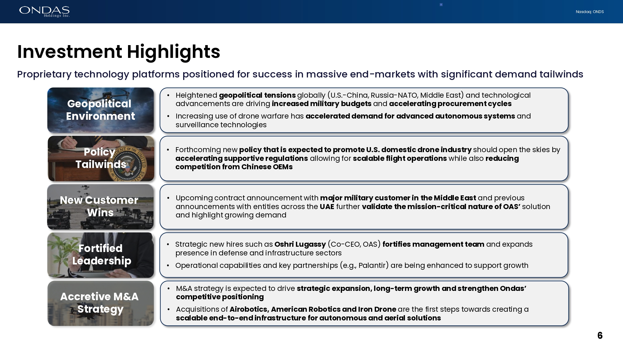 5 Nasdaq: ONDS Leadership Team NEIL LAIRD Interim CFO Neil is an experienced financial executive with over 25 years of performance in the technology sector which includes CFO roles with multiple publicly listed companies. ERIC BROCK CHAIRMAN & CEO Eric is an entrepreneur with over 25 years of management and investing experience. Oshri Lugassy (Brig. Gen. ret.) Co - CEO, OAS Oshri is a defense and technology leader with decades of experience in autonomous systems, global business development and military command. Strictly Confidential