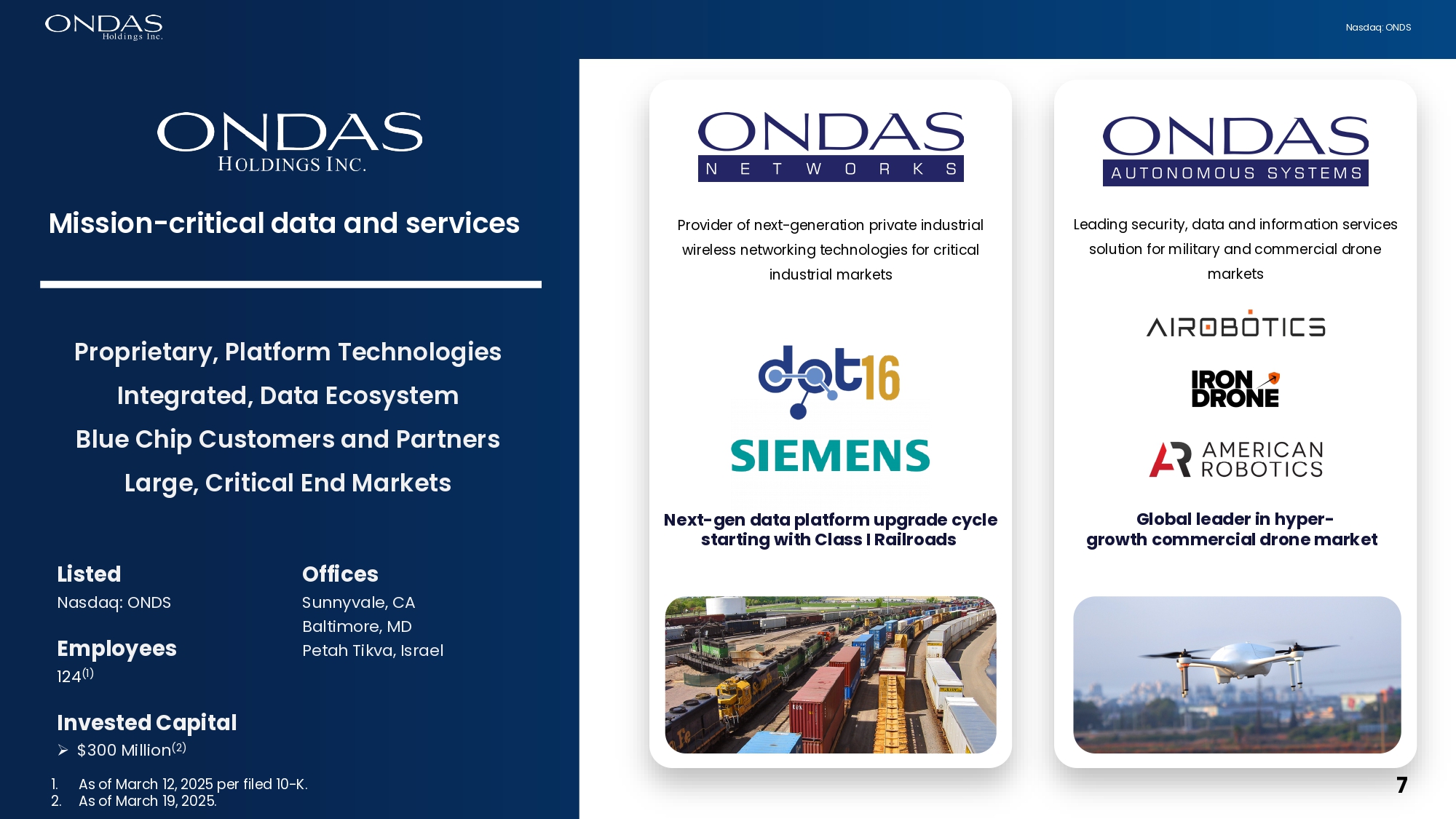 6 Nasdaq: ONDS Investment Highlights Proprietary technology platforms positioned for success in massive end - markets with significant demand tailwinds • Heightened geopolitical tensions globally (U.S. - China, Russia - NATO, Middle East) and technological advancements are driving increased military budgets and accelerating procurement cycles • Increasing use of drone warfare has accelerated demand for advanced autonomous systems and surveillance technologies Geopolitical Environment • Strategic new hires such as Oshri Lugassy (Co - CEO, OAS) fortifies management team and expands presence in defense and infrastructure sectors • Operational capabilities and key partnerships (e.g., Palantir) are being enhanced to support growth Fortified Leadership • Upcoming contract announcement with major military customer in the Middle East and previous announcements with entities across the UAE further validate the mission - critical nature of OAS’ solution and highlight growing demand New Customer Wins • M&A strategy is expected to drive strategic expansion, long - term growth and strengthen Ondas’ competitive positioning • Acquisitions of Airobotics, American Robotics and Iron Drone are the first steps towards creating a scalable end - to - end infrastructure for autonomous and aerial solutions Accretive M&A Strategy • Forthcoming new policy that is expected to promote U.S. domestic drone industry should open the skies by accelerating supportive regulations allowing for scalable flight operations while also reducing competition from Chinese OEMs Policy Tailwinds Strictly Confidential