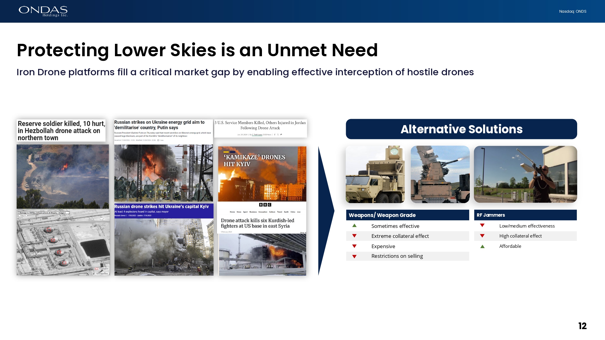 Strictly Confidential 12 Nasdaq: ONDS Alternative Solutions Protecting Lower Skies is an Unmet Need Iron Drone platforms fill a critical market gap by enabling effective interception of hostile drones Weapons/ Weapon Grade Sometimes effective Extreme collateral effect Expensive Restrictions on selling RF Jammers Low/medium effectiveness High collateral effect Affordable