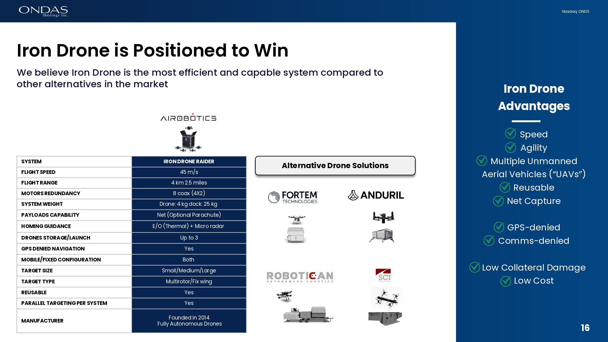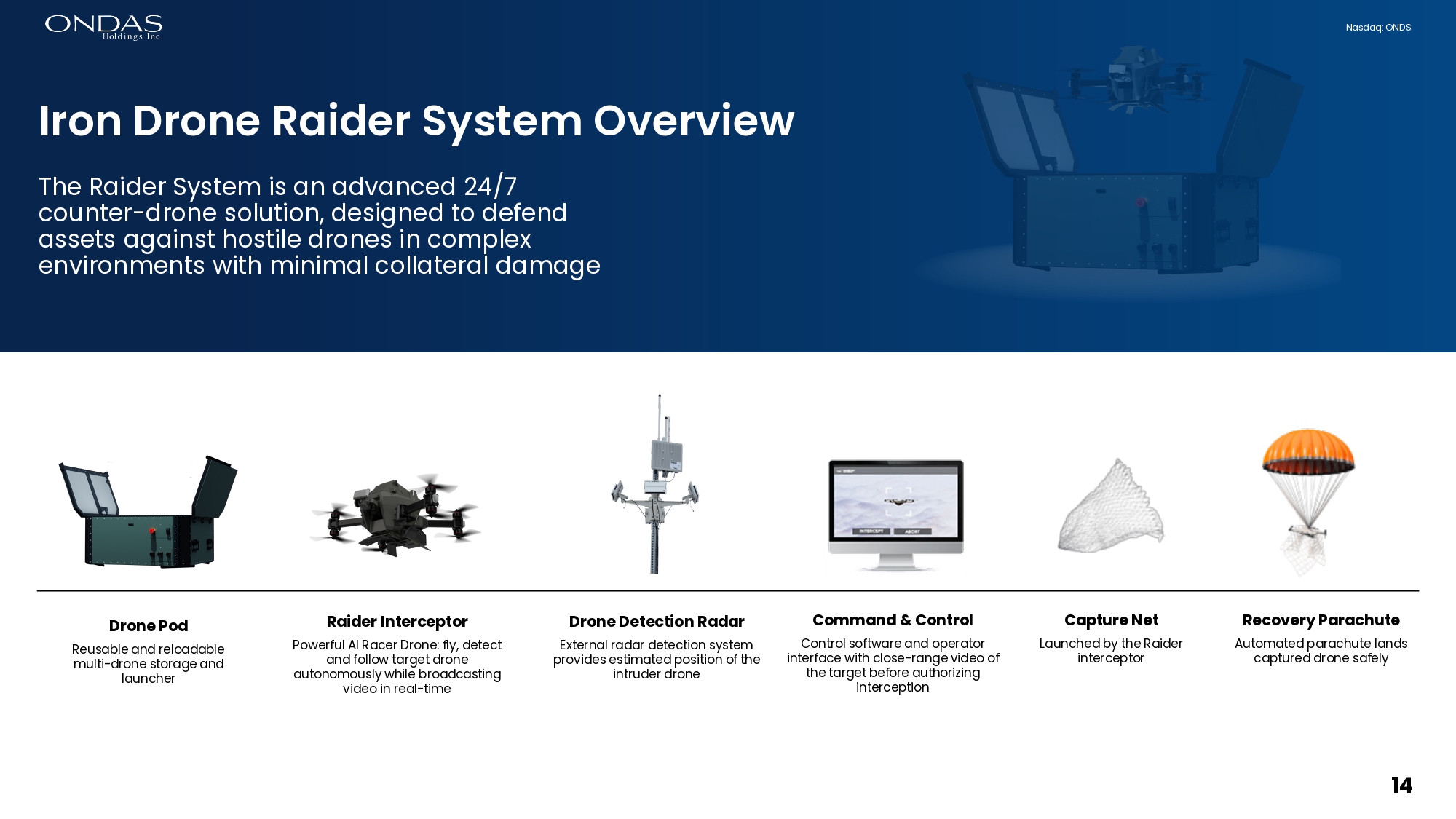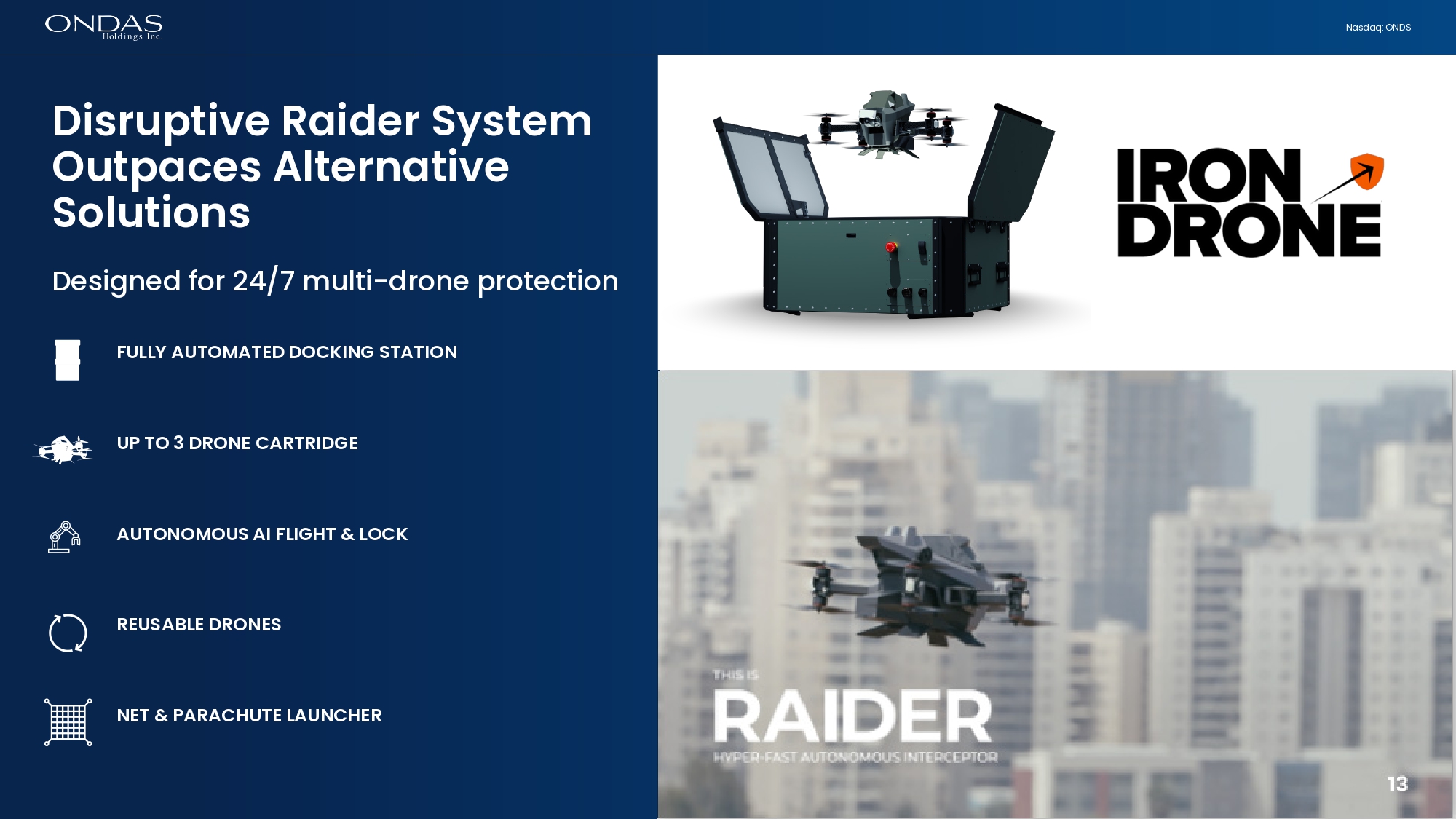 13 Nasdaq: ONDS UP TO 3 DRONE CARTRIDGE AUTONOMOUS AI FLIGHT & LOCK FULLY AUTOMATED DOCKING STATION NET & PARACHUTE LAUNCHER REUSABLE DRONES Disruptive Raider System Outpaces Alternative Solutions Designed for 24/7 multi - drone protection 13