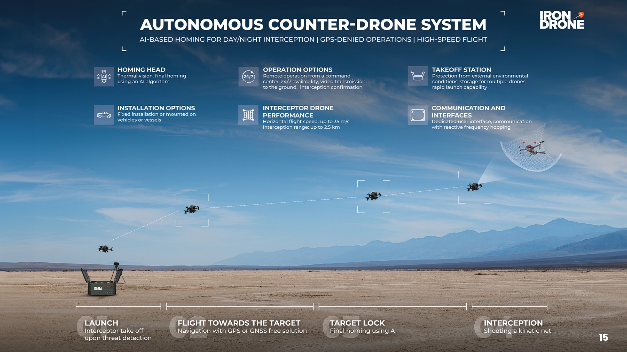 Strictly Confidential 14 Nasdaq: ONDS The Raider System is an advanced 24/7 counter - drone solution, designed to defend assets against hostile drones in complex environments with minimal collateral damage Nasdaq: ONDS Drone Pod Reusable and reloadable multi - drone storage and launcher Drone Detection Radar External radar detection system provides estimated position of the intruder drone Command & Control Control software and operator interface with close - range video of the target before authorizing interception Raider Interceptor Powerful AI Racer Drone: fly, detect and follow target drone autonomously while broadcasting video in real - time Capture Net Launched by the Raider interceptor Recovery Parachute Automated parachute lands captured drone safely Iron Drone Raider System Overview