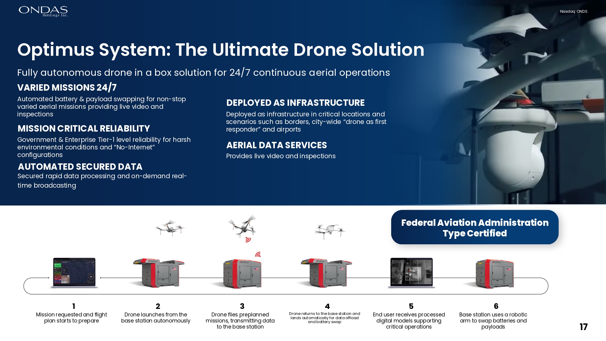 17 Nasdaq: ONDS Optimus System: The Ultimate Drone Solution varied aerial missions providing live video and inspections MISSION CRITICAL RELIABILITY Government & Enterprise Tier - 1 level reliability for harsh environmental conditions and “No - Internet” configurations AUTOMATED SECURED DATA Secured rapid data processing and on - demand real - time broadcasting Fully autonomous drone in a box solution for 24/7 continuous aerial operations VARIED MISSIONS 24/7 Automated battery & payload swapping for non - stop 1 Mission requested and flight plan starts to prepare 2 Drone launches from the base station autonomously 3 Drone flies preplanned missions, transmitting data to the base station 4 Drone returns to the base station and lands automatically for data offload and battery swap 5 End user receives processed digital models supporting critical operations 6 Base station uses a robotic arm to swap batteries and payloads Nasdaq: ONDS Federal Aviation Administration Type Certified DEPLOYED AS INFRASTRUCTURE Deployed as infrastructure in critical locations and scenarios such as borders, city - wide “drone as first responder” and airports AERIAL DATA SERVICES Provides live video and inspections Strictly Confidential