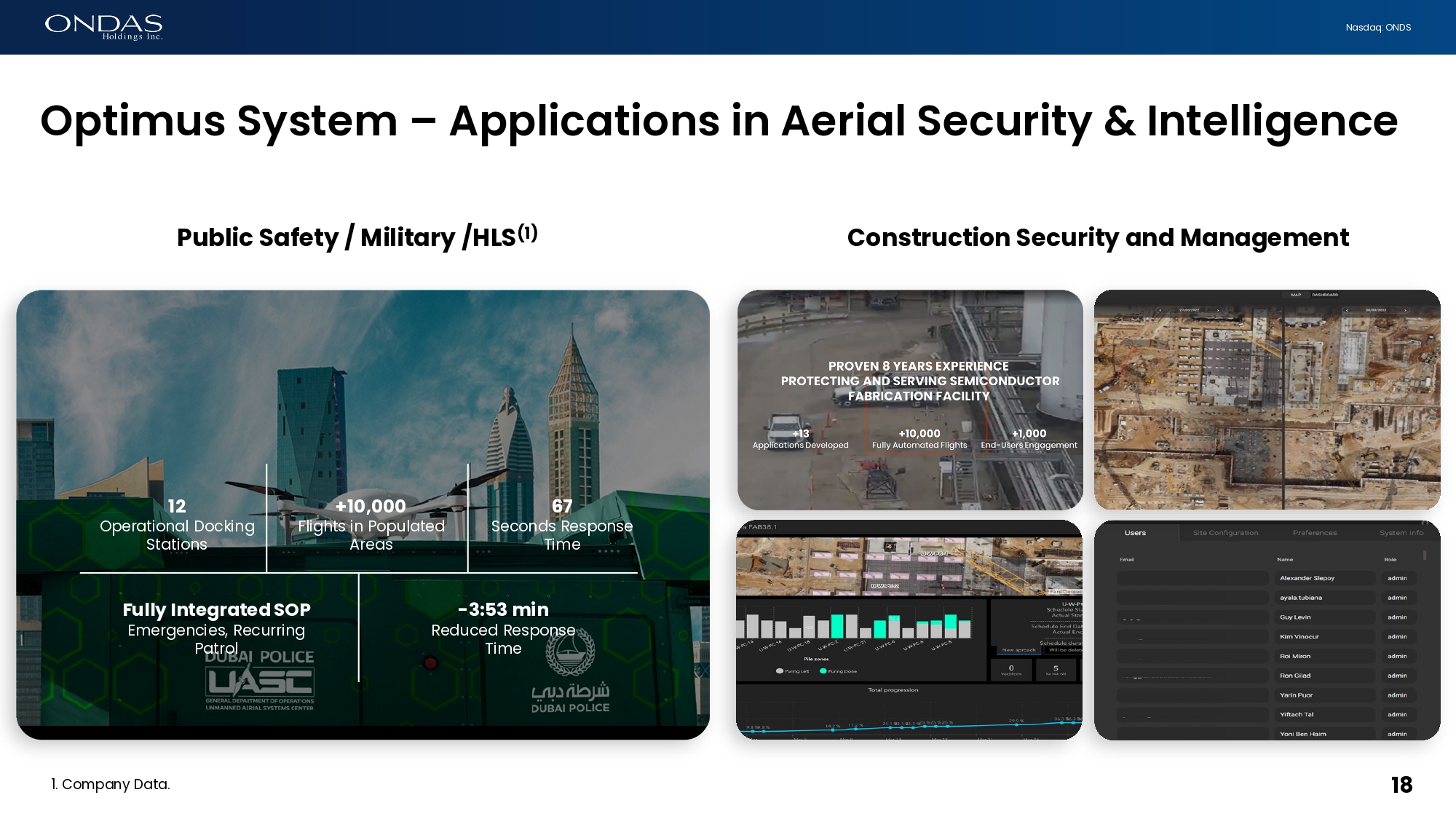 Nasdaq: ONDS Strictly Confidential 18 Public Safety / Military /HLS (1) Construction Security and Management Optimus System – Applications in Aerial Security & Intelligence 1. Company Data. Fully Integrated SOP Emergencies, Recurring Patrol 12 Operational Docking Stations +10,000 Flights in Populated Areas 67 Seconds Response Time - 3:53 min Reduced Response Time