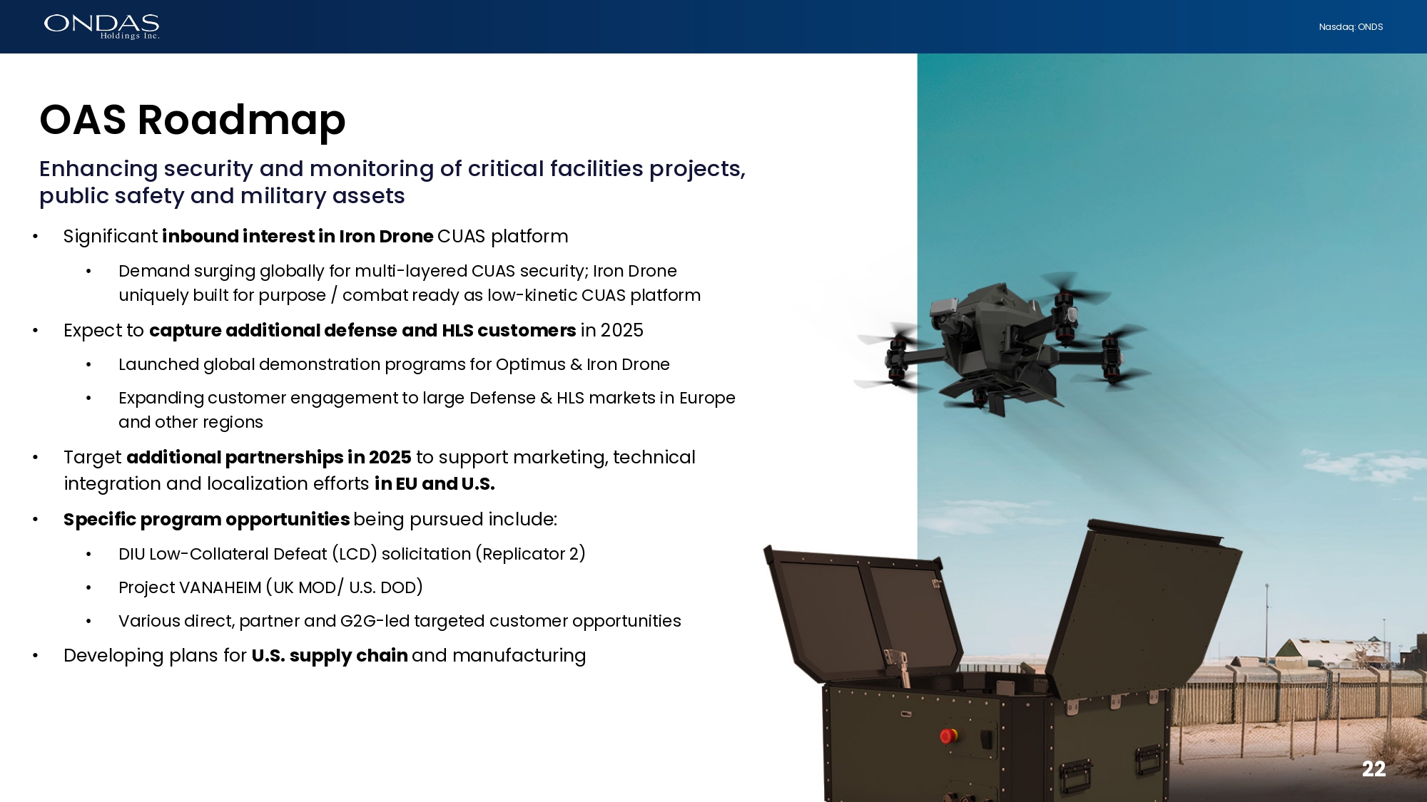 21 Nasdaq: ONDS Palantir Partnership Palantir Foundry to help scale OAS operating platform in support of revenue ramp • What: Ondas has partnered with Palantir Technologies to integrate the Palantir Foundry platform into its operations, enhancing its autonomous drone platforms. • Why: The partnership aims to unify data and streamline operations, enabling scalable adoption of Ondas' Optimus System and Iron Drone Raider globally. • Benefits: Foundry's AI - driven insights will optimize supply chain, production workflows, and customer engagement, delivering superior value to commercial and military clients. Strictly Confidential 21