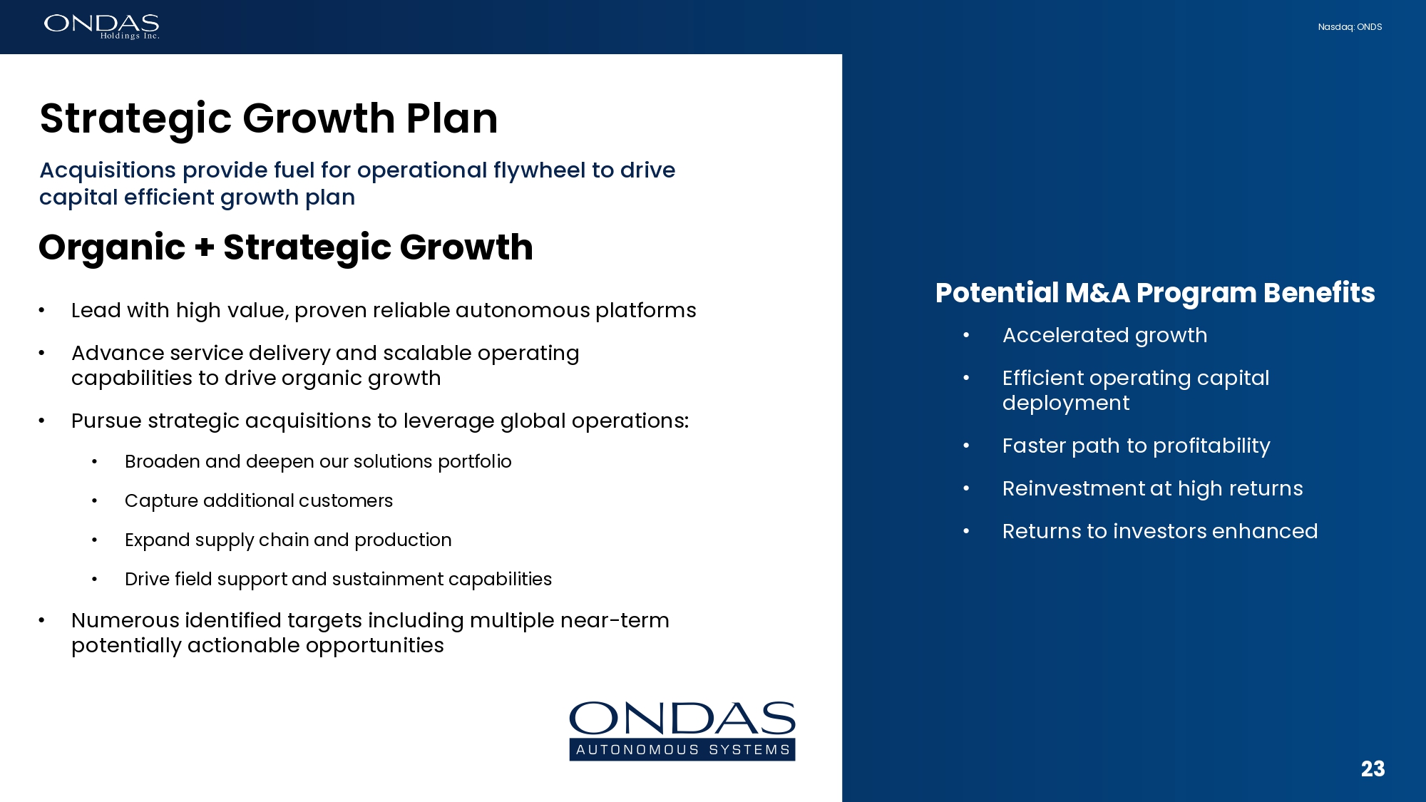 22 Nasdaq: ONDS OAS Roadmap Enhancing security and monitoring of critical facilities projects, public safety and military assets • Significant inbound interest in Iron Drone CUAS platform • Demand surging globally for multi - layered CUAS security; Iron Drone uniquely built for purpose / combat ready as low - kinetic CUAS platform • Expect to capture additional defense and HLS customers in 2025 • Launched global demonstration programs for Optimus & Iron Drone • Expanding customer engagement to large Defense & HLS markets in Europe and other regions • Target additional partnerships in 2025 to support marketing, technical integration and localization efforts in EU and U.S. • Specific program opportunities being pursued include: • DIU Low - Collateral Defeat (LCD) solicitation (Replicator 2) • Project VANAHEIM (UK MOD/ U.S. DOD) • Various direct, partner and G2G - led targeted customer opportunities • Developing plans for U.S. supply chain and manufacturing Strictly Confidential 22