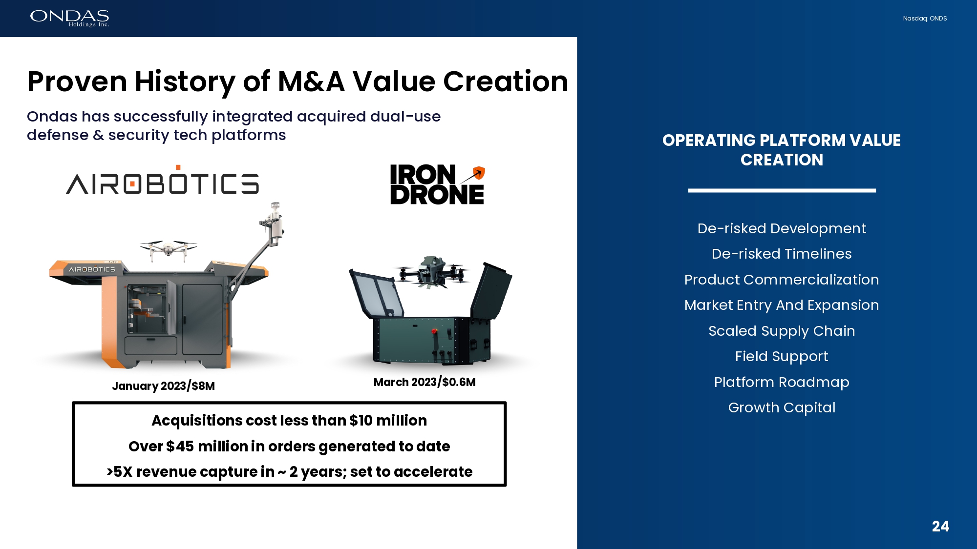 23 Nasdaq: ONDS Strategic Growth Plan Potential M&A Program Benefits • Accelerated growth • Efficient operating capital deployment • Faster path to profitability • Reinvestment at high returns • Returns to investors enhanced Acquisitions provide fuel for operational flywheel to drive capital efficient growth plan Organic + Strategic Growth • Lead with high value, proven reliable autonomous platforms • Advance service delivery and scalable operating capabilities to drive organic growth • Pursue strategic acquisitions to leverage global operations: • Broaden and deepen our solutions portfolio • Capture additional customers • Expand supply chain and production • Drive field support and sustainment capabilities • Numerous identified targets including multiple near - term potentially actionable opportunities Strictly Confidential 23