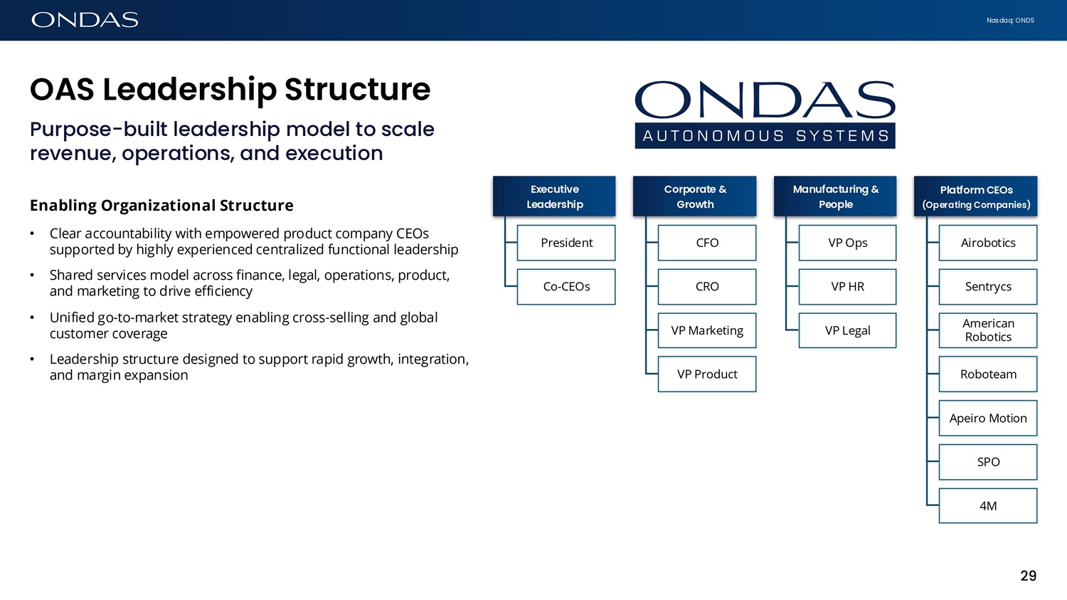 Nasdaq: ONDS Sc6l6ble Oper6tifig Pl6tform Building a unified, high - growth operating engine Infrastructure for Operating Scale • Integrate OAS Core, acquisitions, leadership, and talent into a unified operating platform • Align global go - to - market execution across sales teams, partners, and customers • Centralize manufacturing, supply chain, and distribution to support scalable production • Invest in leadership, systems, and ecosystem partnerships to enable rapid integration and execution Strategic & Financial Outcomes • Increased operating leverage as multiple platforms scale on shared infrastructure • Faster commercialization and monetization of acquired capabilities • Improved unit economics and lower field support costs as installed base expands OAS CORE T6lefi t Techfiolog y P6rtfier s ACQUIRED CAPABILITIES S6les Te6ms Customer s P6rtfier s Techfiolog y NEW TALENT Advisory Bo6rd Le6dership Te6m ECOSYSTEM M6fiuf6cturifi g Distributiof i Techfiolog y INFRASTRUCTURE GO - TO - MARKET OPERATING PLATFORM 28
